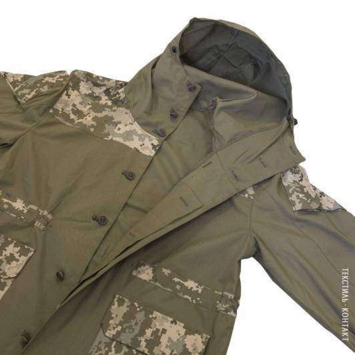 - Пиксельный камуфляж сочетается с частями, выполненными в цвете хаки.