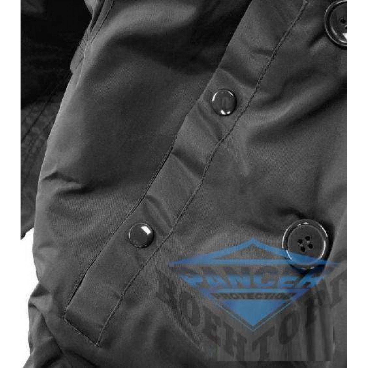 Верхняя ткань устойчива к воде и снегу, что важно в условиях повышенной влажности. Меховая опушка на капюшоне снижает продуваемость, а объёмная подкладка формирует мощный теплоизоляционный слой. Ветрозащитная планка на пуговицах исключает продувание молнии. Манжеты из плотного трикотажа фиксируют запястье и удерживают тепло.