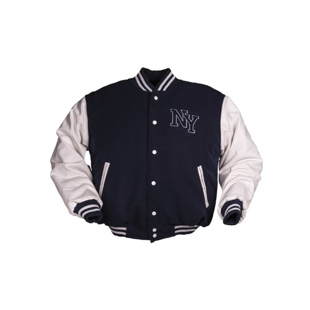 Стильный, двухцветные бейсбол куртка. Почерк 'NY' на левой области груди. 2 кармана на стороне. Внутренний карман. Защелкой перед. Вязаные рант на рукавах, подоле и воротник