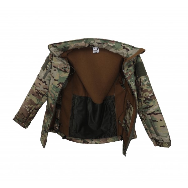 Куртка создана из плотного Soft Shell-материала, который защищает от ветра и лёгких осадков, сохраняя при этом дышащие свойства. Флисовая подкладка удерживает тепло и делает изделие комфортным при длительном ношении. Складной капюшон скрывается в воротнике и при необходимости легко достаётся. Два горизонтальных нагрудных кармана на молниях подходят для документов и лёгкого снаряжения. Боковые карманы используются для согревания рук или переноски мелочей, а карманы на рукавах оснащены Velcro-панелями для патчей.