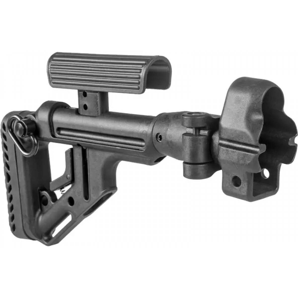 Приклад изготовлен из ударопрочного пластика, складывается на правую сторону.