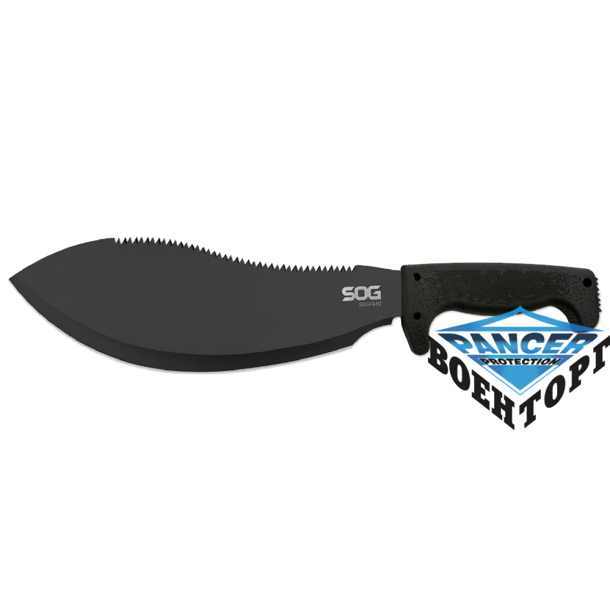 Мачете с изогнутым лезвием SOGFari Bolo от компании SOG. Представленный мачете оснащен режущим лезвием типа Drop-Point, данный тип лезвия похож на клинок с прямым обухом, но присутствует отличие в том что, точка острия данного клинка опущена и находится на основной оси нагрузки при колющем движении или ударе. При такой форме клинка повышается уровень удобства вхождения в материал, то есть удобство протыкать им что-либо. С такими колющими характеристиками, инструмент становится достаточно универсальным в применении. Имея широкий спектр использования начиная от садоводства до различных военных целей. Клинок товара изготовлен из стали 3CR13, которая имеет специальное покрытие из черного порошка придающее матовый оттенок изделию.