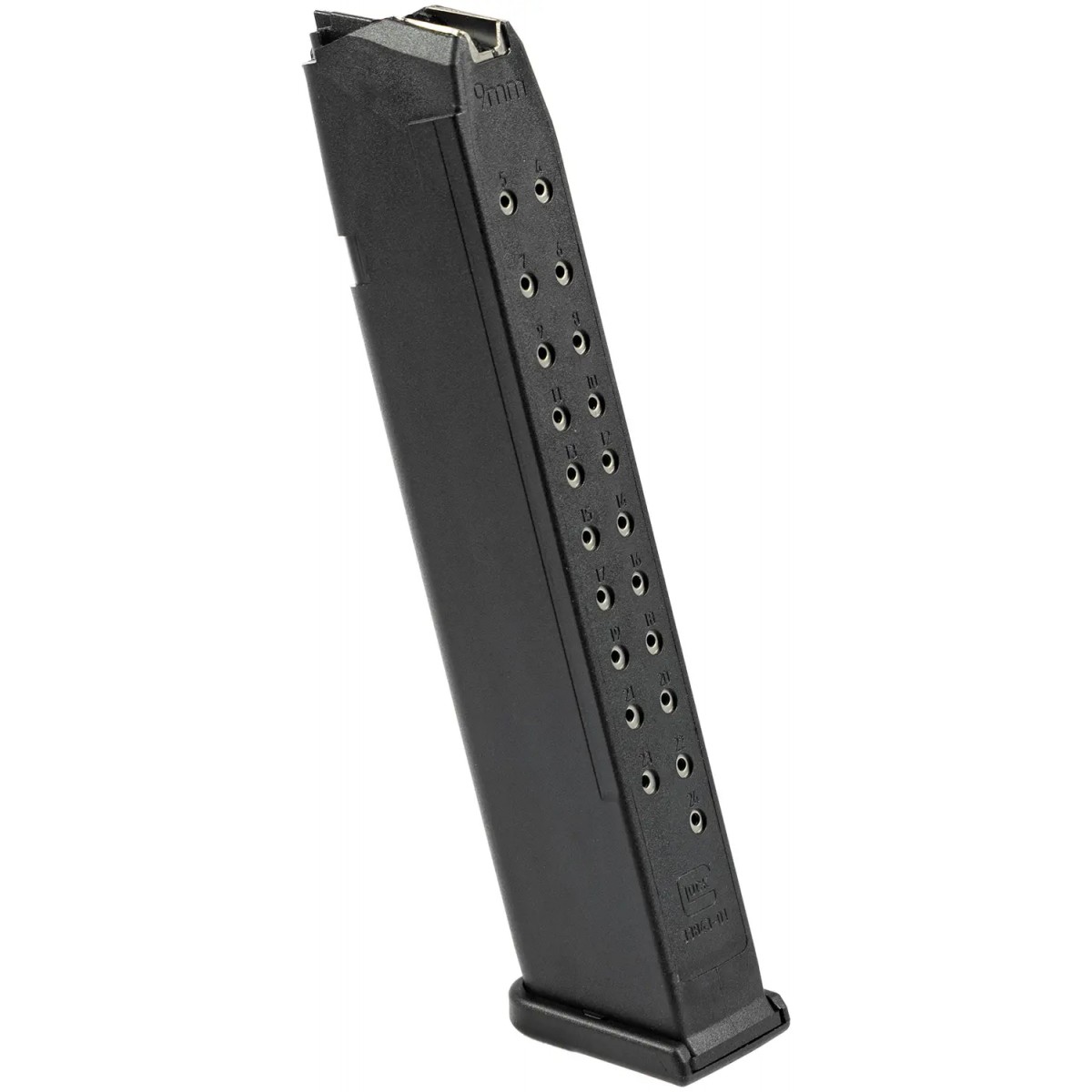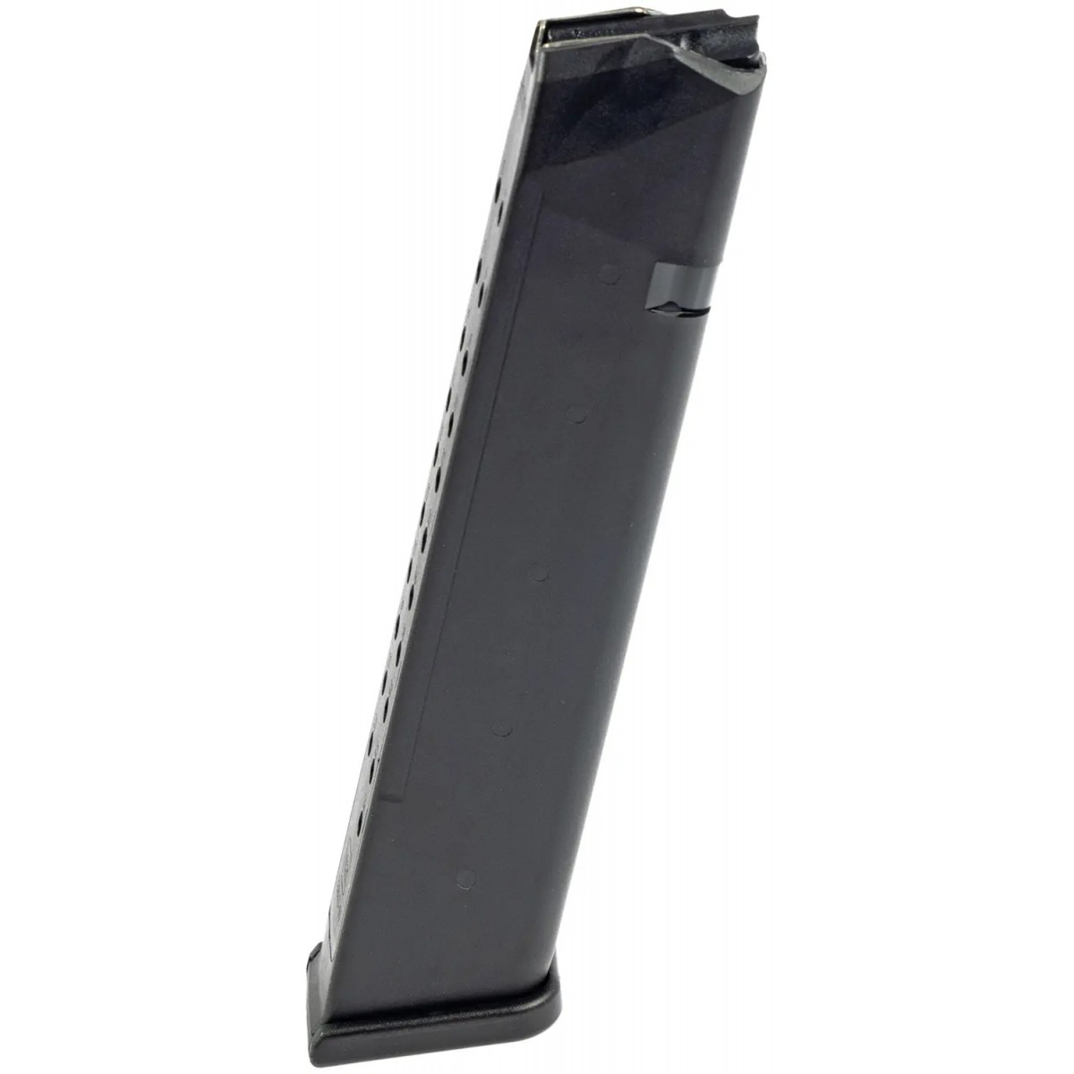 Оригинальный магазин для спортивных пистолетов Glock калибра 9x19. Корпус магазина изготовлен из стали и облицован ударопрочным полимером. Предусмотрены отверстия индикации количества патронов. Пятка - пластиковая. Рассчитан на 24 патрона.