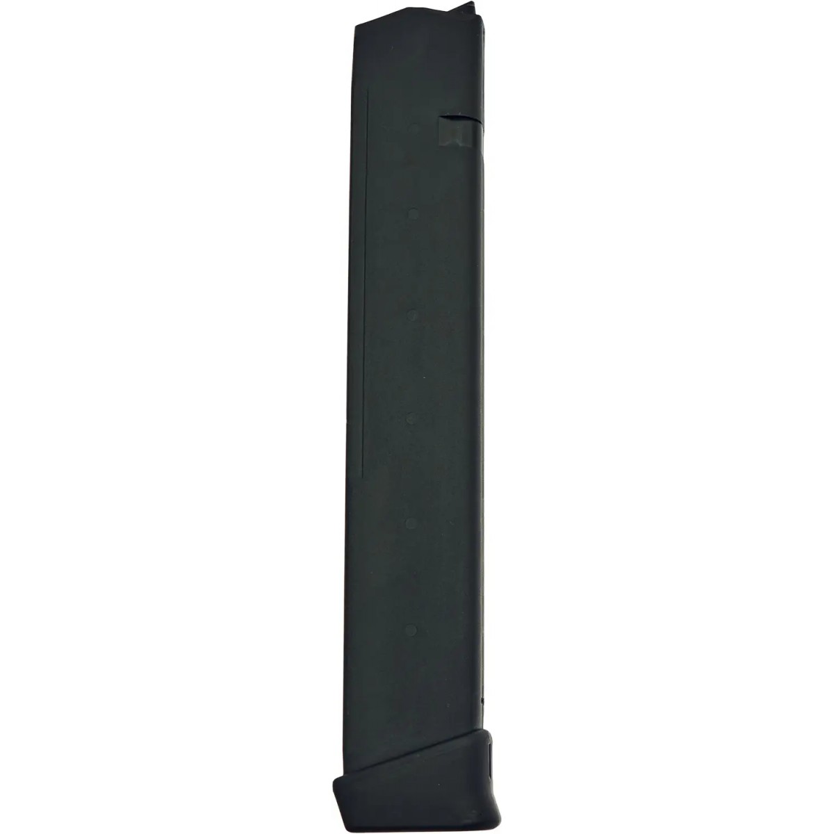 Оригинальный магазин для спортивных пистолетов Glock калибра 9x19. Корпус магазина изготовлен из стали и облицован ударопрочным полимером. Предусмотрены отверстия индикации количества патронов. Пятка - пластиковая. Рассчитан на 33 патрона.