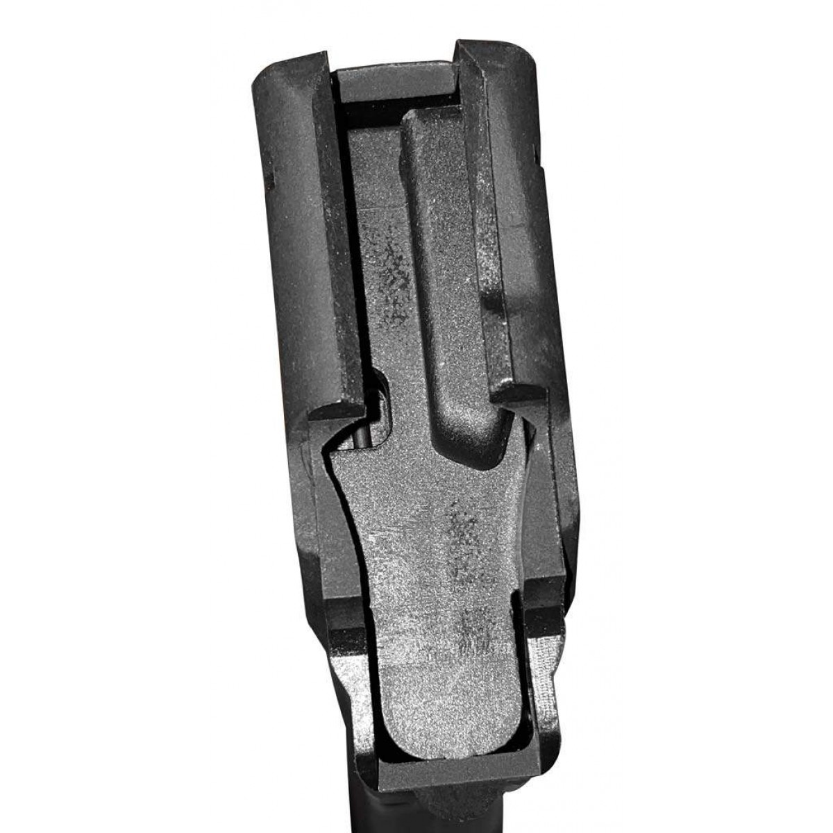 - Магазин быстро и легко разбирается для обслуживания и чистки. Для разборки магазина нужно нажать и утопить кнопку фиксатора в пятке магазина, сдвинуть металлическую крышку назад