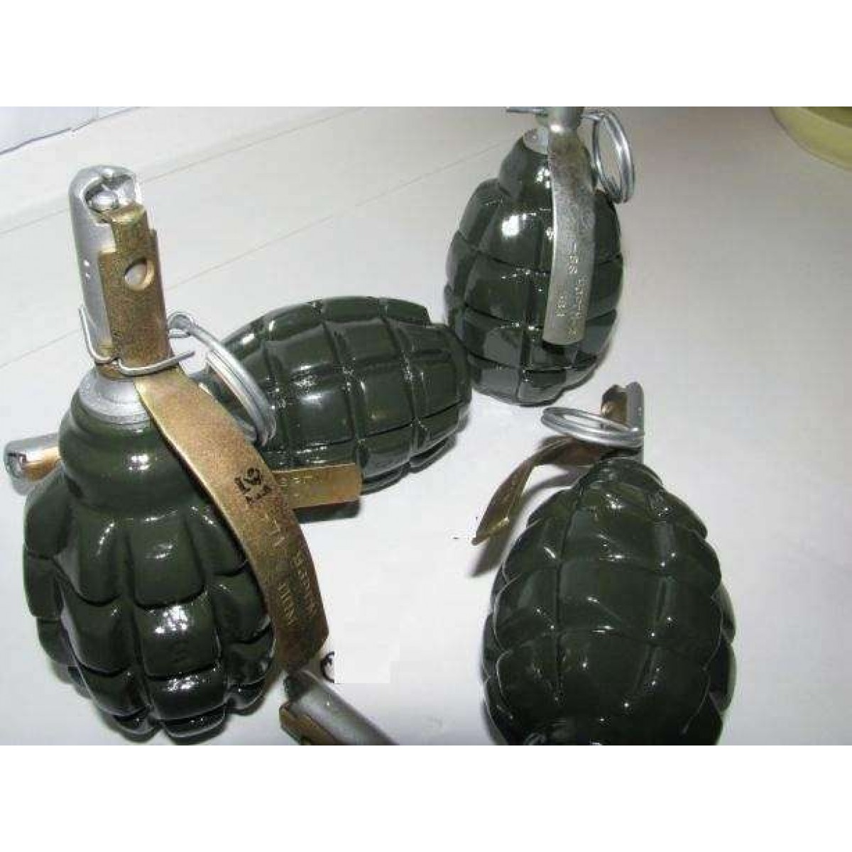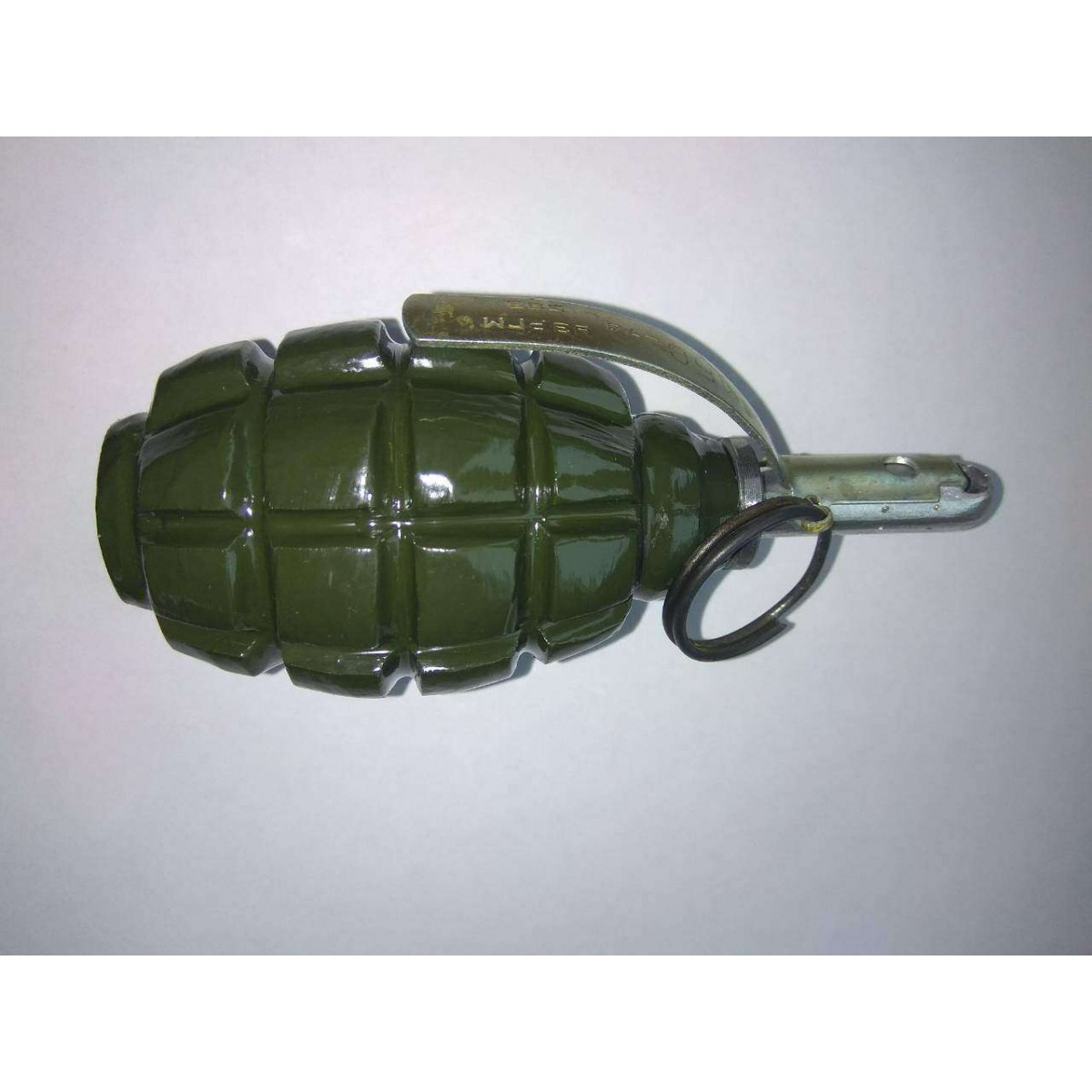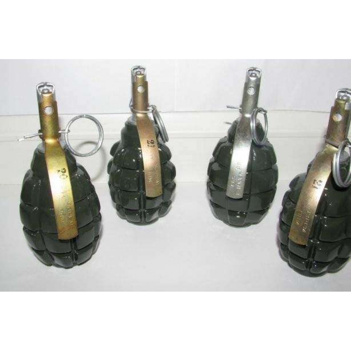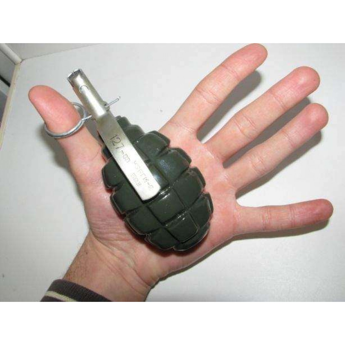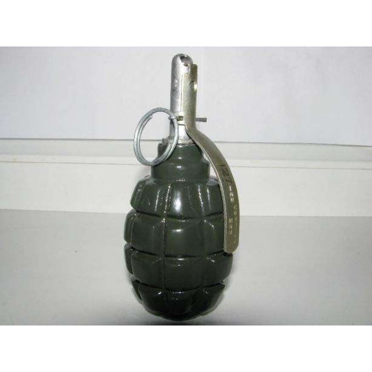 Корпус литой, сделан из сплавов металла (не чугун), немного легче настоящей гранаты. Макет - настоящей боевой гранаты Ф-1. Запал металлический, скоба отлетает.