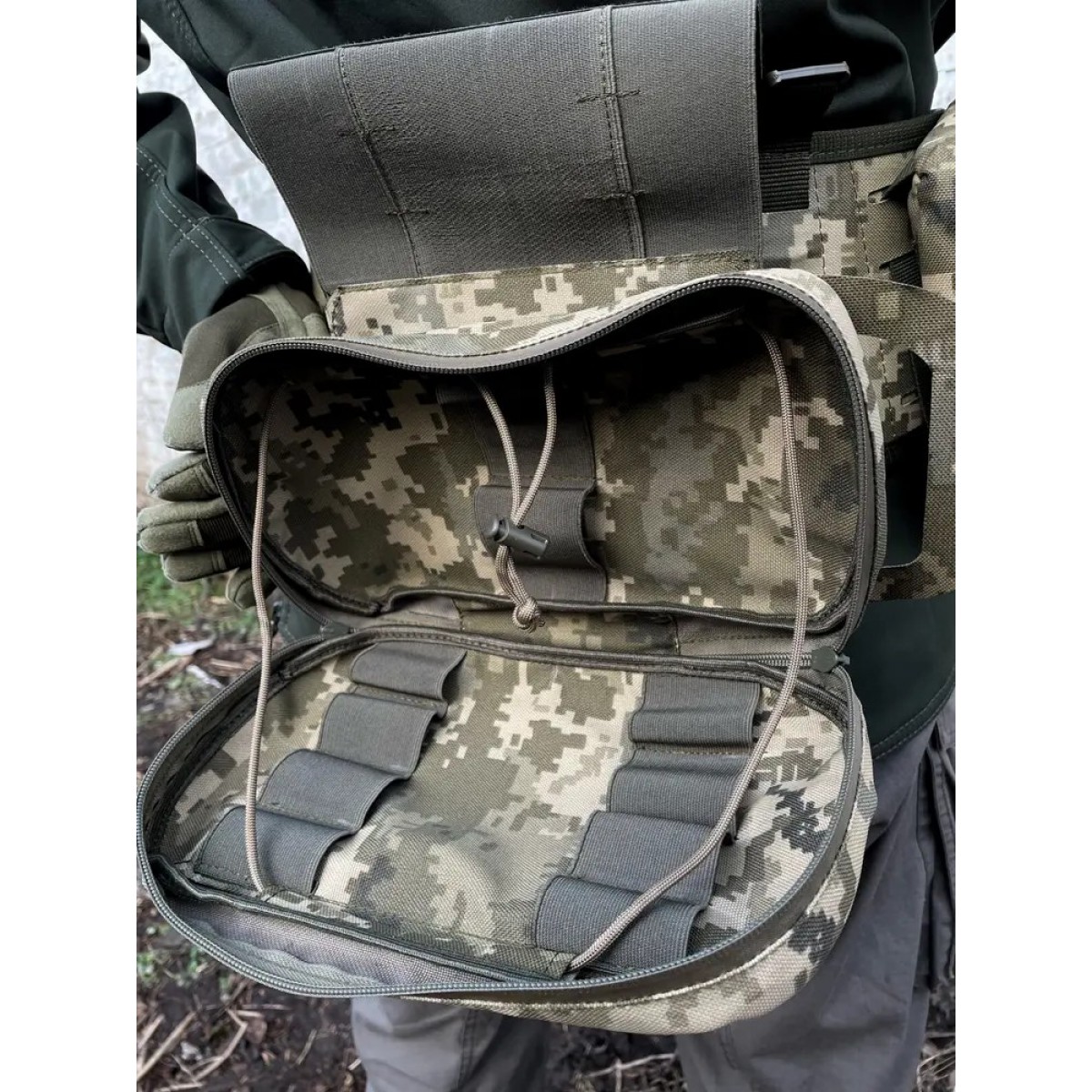 Тактический подсумок от бренда uaBRONIK является идеальным решением для оказания первой медицинской помощи. Этот подсумок состоит из двух частей: сумки с внутренним органайзером для индивидуальной аптечки первой помощи и базы, которая крепится к снаряжению и служит основой сумки.