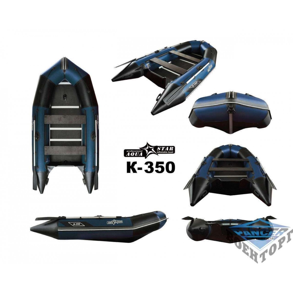 Aqua Star, K-350 - надувная моторная лодка длиной 3,50 метра. Вес лодки распределяется на две сумки: с лодкой и комплектацией. Наиболее подверженные повреждениям участки делают из более толстого ПВХ черного цвета. Выпускается с одним видом палубы - RFD - жесткая разборная палуба для килевых лодок из 12 мм. фанеры с антискользящим покрытием. Комплектуется алюминиевыми замками для быстрого монтажа. Покрывает дно лодки полностью, усиливает его и делает гораздо жестче.