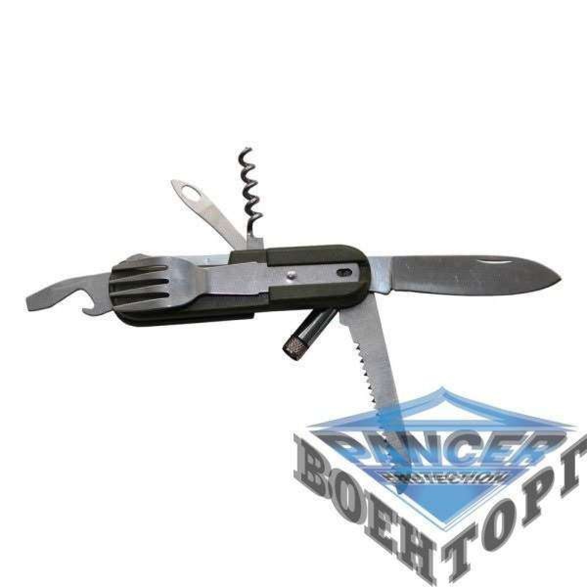 Многофункциональный нож со столовыми принадлежностями, состоит из карманного раскрывающегося ножа с дополнительными элементами открывашка, штопор, пилка. Столовые принадлежности закреплены на корпусе ножа и при необходимости снимаются с него для их использования. Изготовлен из нержавеющей стали, рукоятка из полимера (пластик). Незаменимый карманный нож для походов, отдыха на природе, рыбалке. Особенности: • Удобный столовый набор; • Хорошее качество сборки; • Компактный размер и небольшой вес.