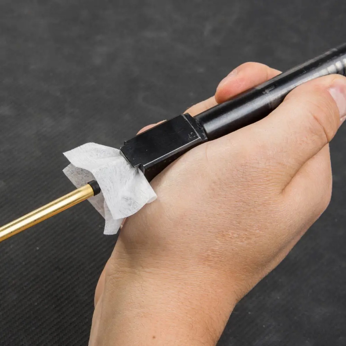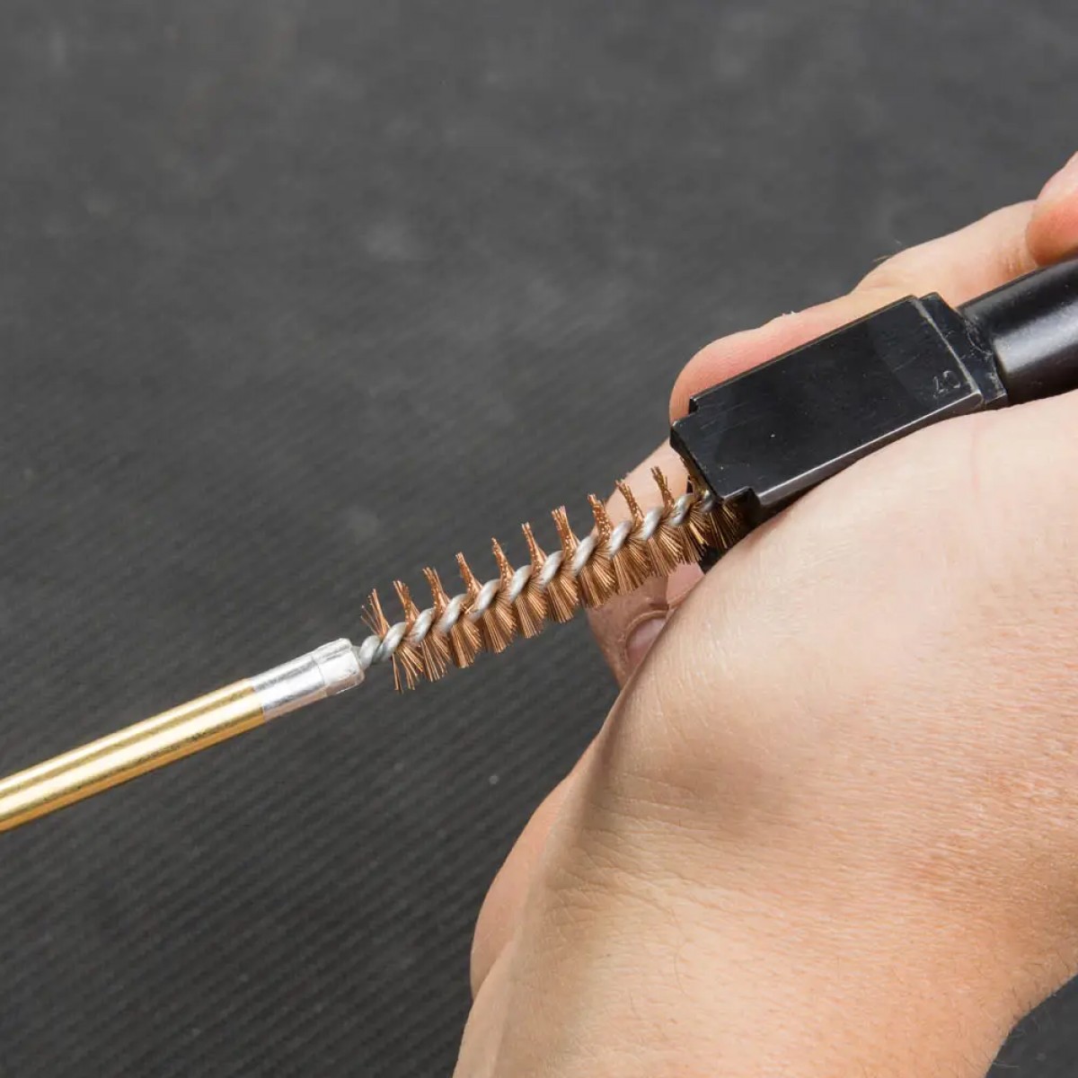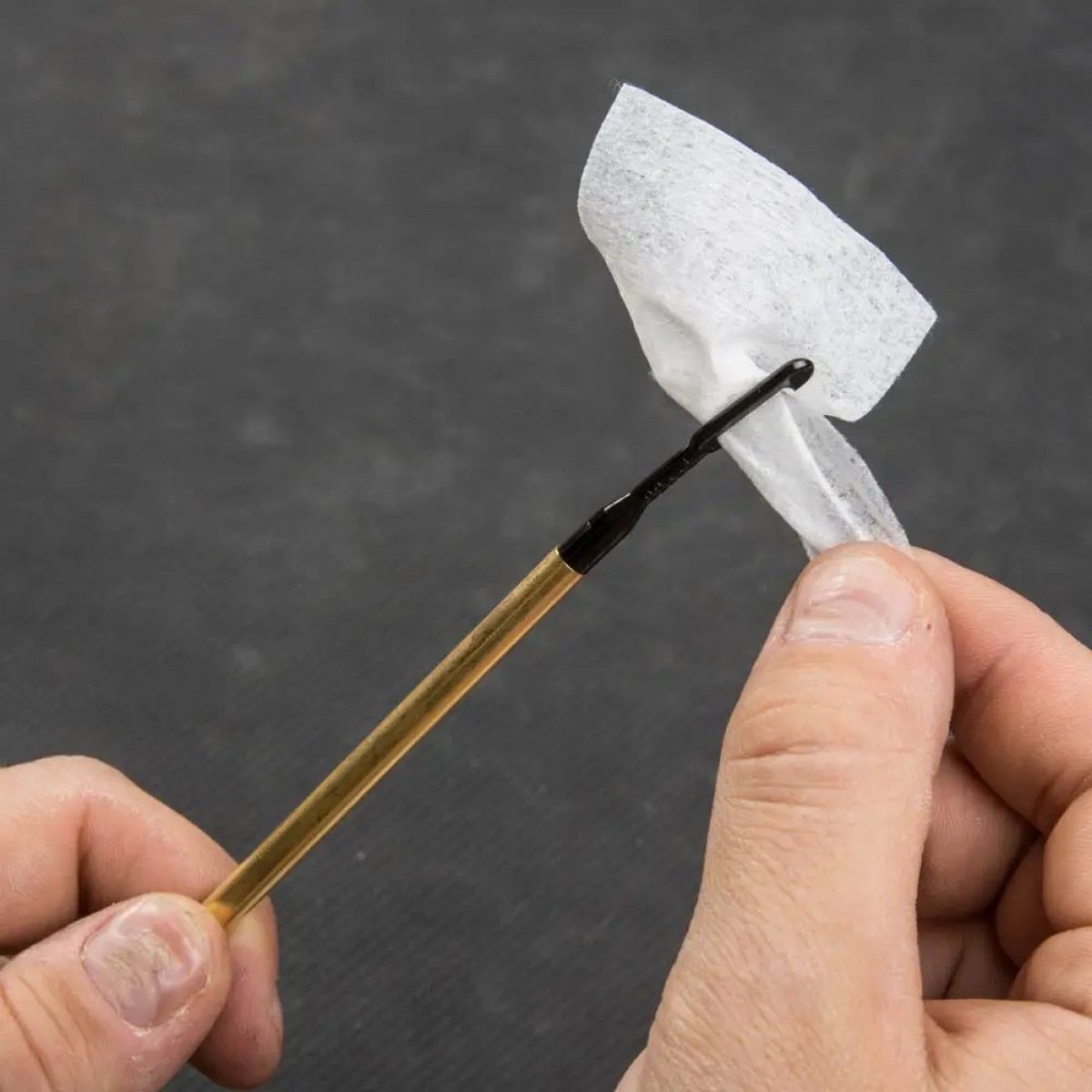 У набор для чистки входит: двухсекционный латунный шомпол 12,5", вращающаяся рукоятка, ерши из фосфорной бронзы калибров.22, 9 мм/.357/.38,.40,.45, вишеры-иглы калибров.22, 9 мм/.357/.38,.40,.45, большой и малый вишер-петля, 25 патчей, компактный кейс-комплект с откидной подставкой.
