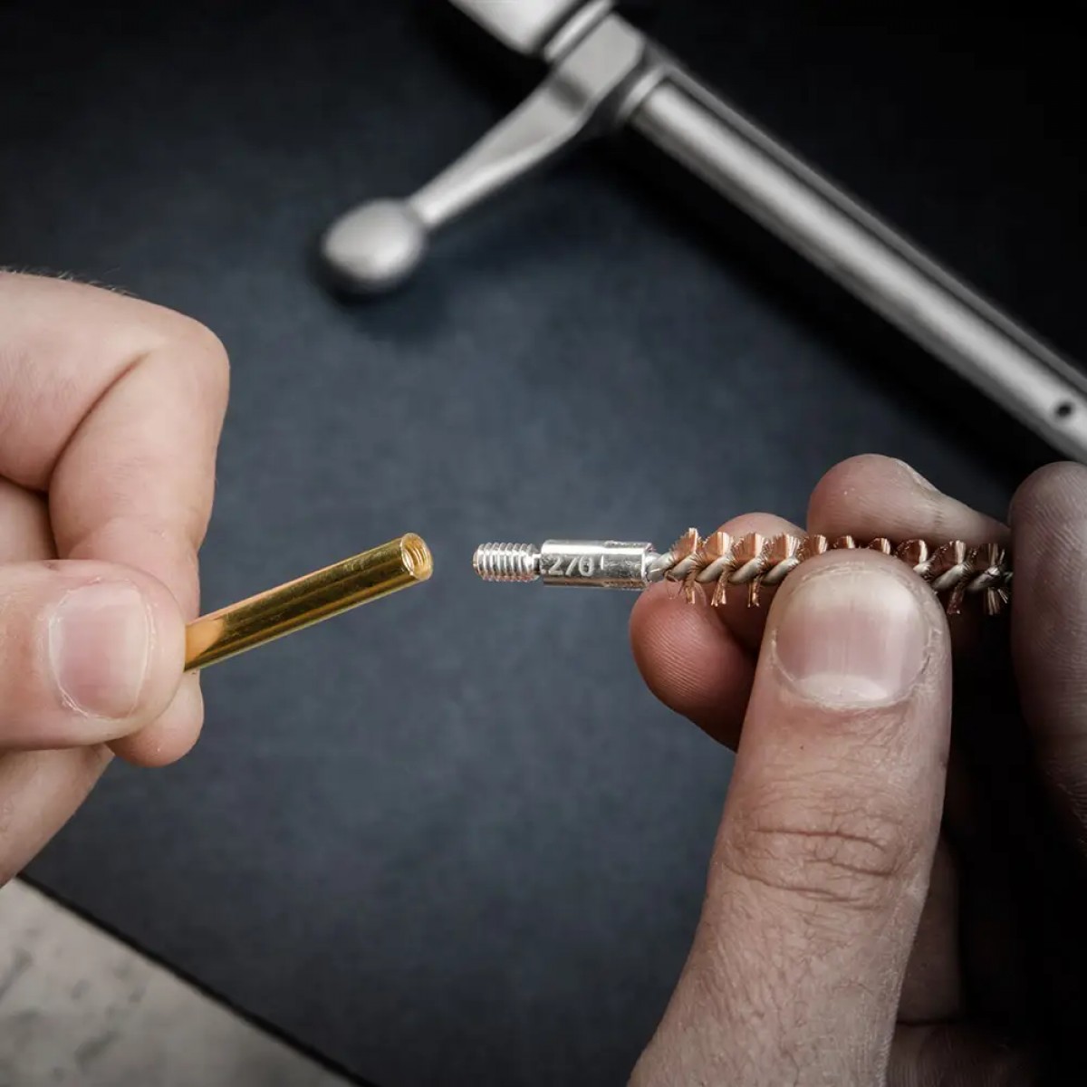 В комплект входит: эргономичная вращающаяся рукоятка, трехсекционный шомпол 32", ершики с бронзовой щетиной для кал. 22 -.45, 20 и 12, вишеры-иглы для кал. 22 -.45, два латунных вишера-петли, две пуховки кал. 12 и 20, 50 патчей, пластиковый кейс-органайзер.