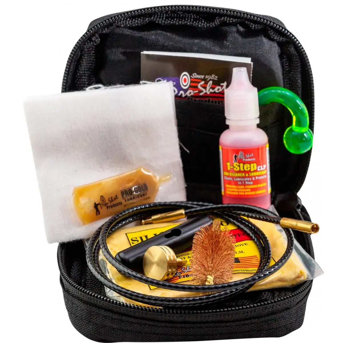 Набор для чистки оружия Pro-Shot поставляется в небольшом удобном чехле, который можно закрепить на рюкзаке или сумке. В состав набора входит: Черный тактический чехол; Протяжка с оплеткой; Полноразмерная ручка для протяжки, из анодированного алюминия; Ершик, основание латунное, щетинки бронзовые; Средство для чистки; Вишер; Круглые патчи; Силиконовая салфетка; Смазка Pro-Gold; Инструкция по чистке оружия. Сделано в США.