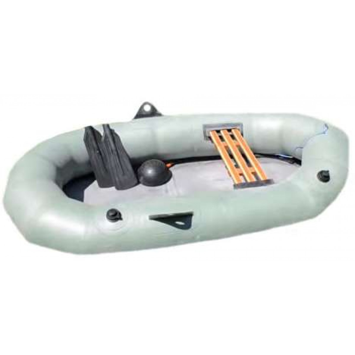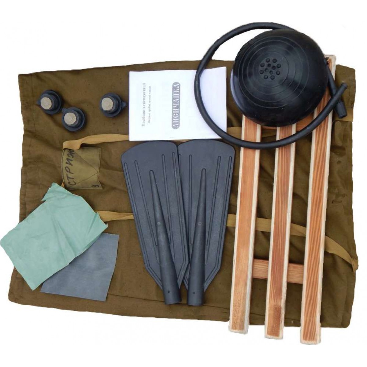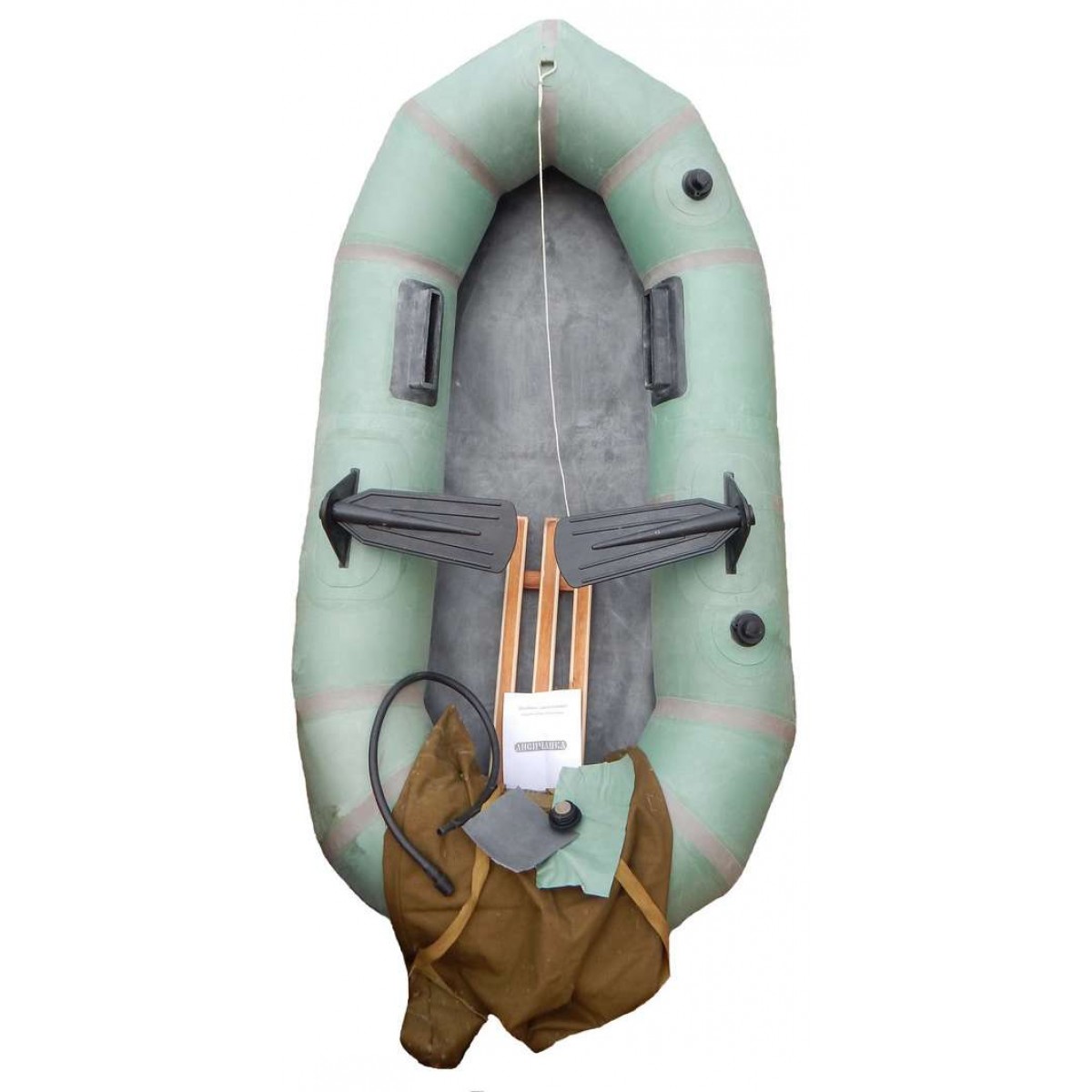 Весла (без древок), насос, мешок-чехол для переноски, одно жесткое сиденье, паспорт, запасной клапан, латки для ремонта