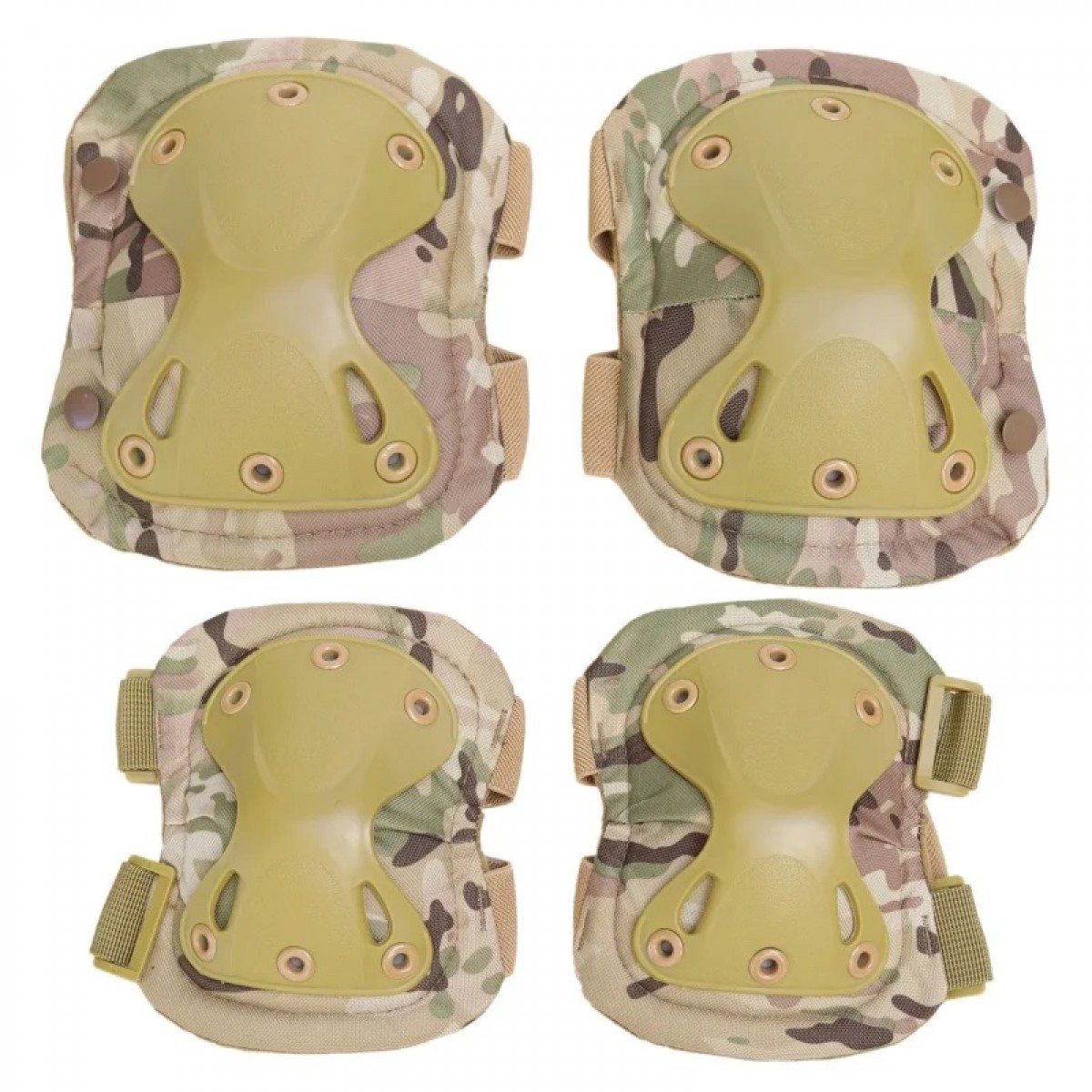 Тактическая защита наколенники и налокотники. Изначально, такие наборы массово выпускались, как защитная экипировка военных, чтобы смягчить нагрузку и предотвратить травмы. Наколенники надежно и прочно защищают коленные суставы, которые подвержены большой нагрузке при беге и ходьбе. Пластиковая вставка из сверхпрочного материала надёжно предохраняет от травм и локтевые суставы. Обратите внимание на Х-образную форму накладок. Такая уникальная форма делает эти детали тактической защиты гибкими и превосходно поглощает силу удара. Смягчает силу удара и амортизирующая прокладка. Кроме того, наколенники и налокотники долговечны, так как они предназначены для прохождения через суровую пустыню и скалистые окрестности, с большим количеством камней и грязи. Тканевая часть оливкового цвета выполнена из плотного полиэстера, который прекрасно пропускает воздух. Два ремня с обратной стороны обеспечивают дополнительный комфорт и безопасность. Широкие ремешки из эластичного материала плотно прилегают к телу. Благодаря регулируемым ремешкам наколенники и налокотники подойдут для различных размеров.