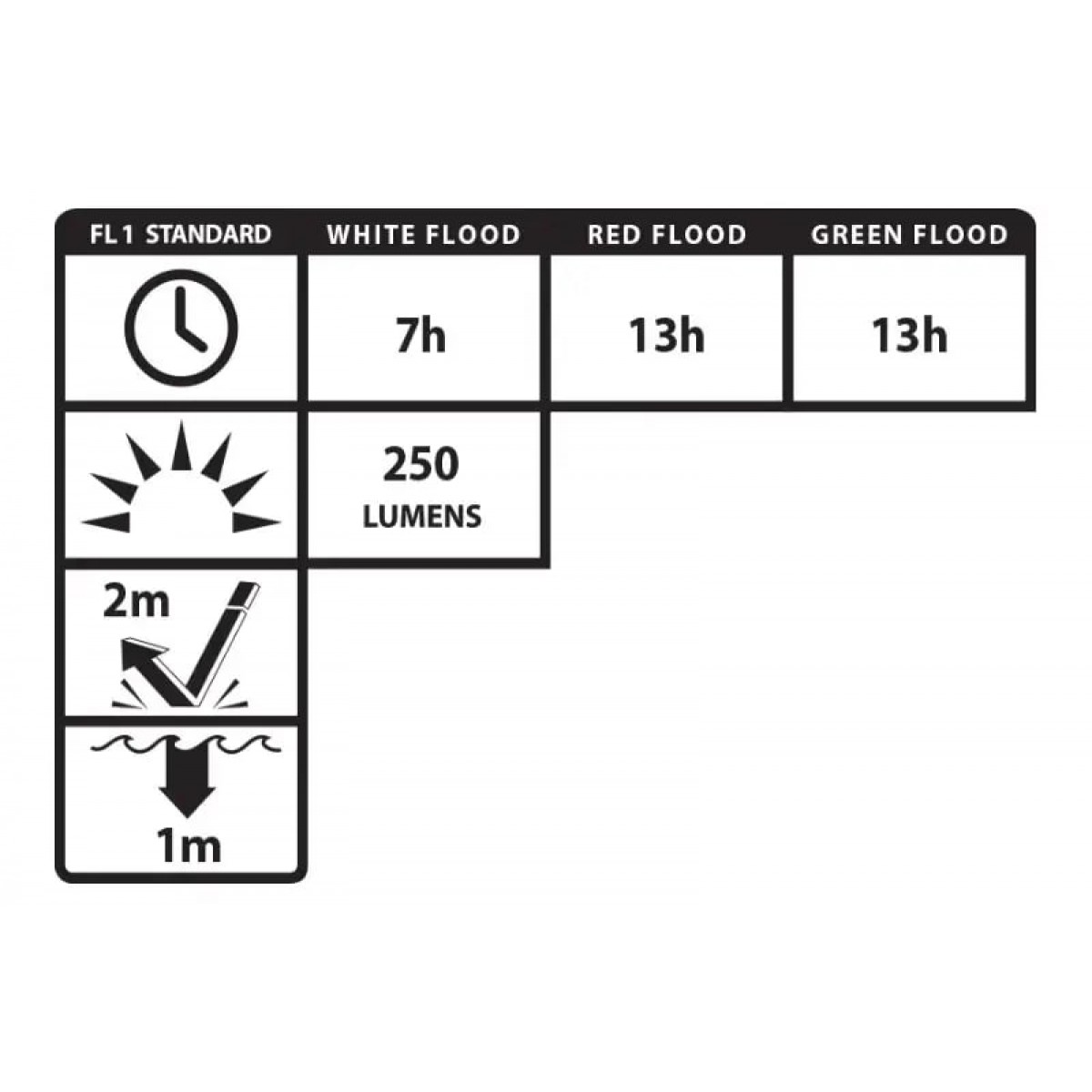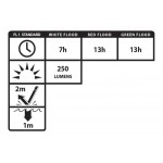 В режиме белого света налобный фонарь имеет мощность 250 люмен в течение 7 часов в высоком режиме и 60 люмен до 35 часов в низком режиме. Режимы красного и зеленого света работают более 12 часов.