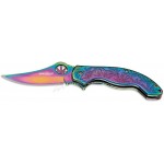 Удобный складной нож серии Rainbow с покрытием, переливающимся всеми цветами радуги. Colorado Rainbow легко приводится в рабочее положение одной рукой. Прочная, выполненная из нержавеющей стали рукоять украшена узорами в виде листьев конопли. Стальной клинок фиксируется в открытом положении при помощи механизма лайнерлок.