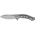 Boker Magnum Slender вызывает восторг уже при первом знакомстве. Нож выглядит довольно хрупким, но первое впечатление обманчиво. Благодаря превосходной эргономике изогнутой легкой стальной рукояти он отлично лежит в руке и остается достаточно крепким и надежным. Устойчивый к коррозии клинок типа drop-point из стали 440A фиксируется замком фреймлок. Плавник позволяет легко открыть нож одной рукой.