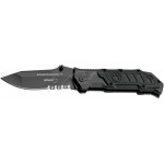 Клинок типа clip point изготовлен из нержавеющей стали 440С и имеет черное титановое покрытие, извлекается при помощи шпенька и фиксируется в открытом положении механизмом лайнерлок. Тип режущей кромки – полусеррейтор. Алюминиевая рукоять с накладками из стеклотекстолита G10 обеспечивает надежный хват. Нож имеет упоры с насечками для большого пальца, оснащен клипсой.