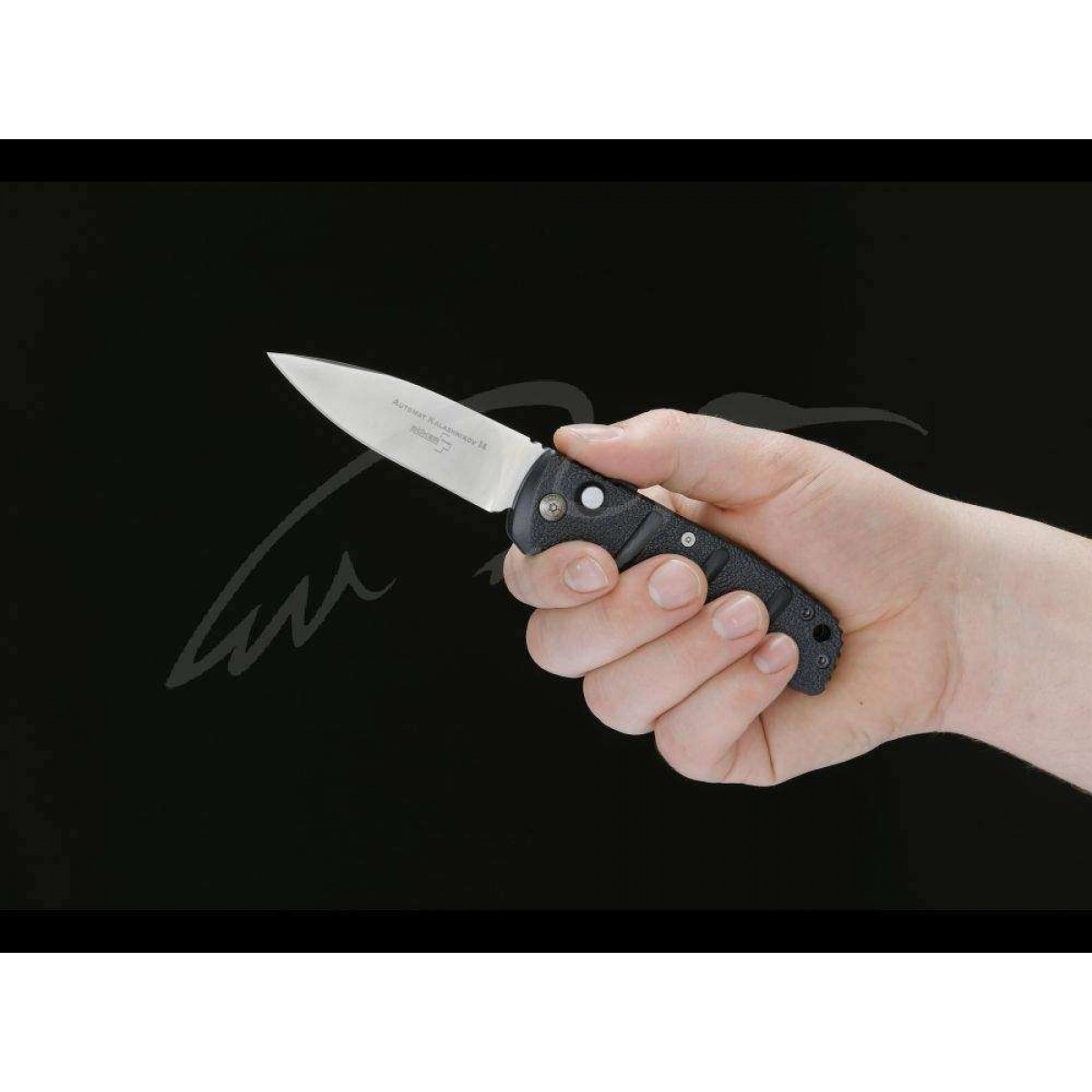 Серия ножей AK посвящена самому популярному оружию в мире - легендарному Автомату Калашникова. Все ножи, носящие имя Калашникова, официально лицензированы.Нож AKS 74 гармонично объединил в себе черты штыкового ножа автомата АК-74 (в часности рукоятку) и оригинальный клинок копьеподобной формы. Такое сочетание обеспечивает одновременно высокие показатели реза, а также надежность и комфорт при удержании. На рукоятку нанесены насечки и подпальцевые выемки для дополнительного фиксации ножа в руке. Но основной "изюминкой" ножа является подпружиненный клинок, который автоматически выдвигается при нажатии кнопки на рукоятке.