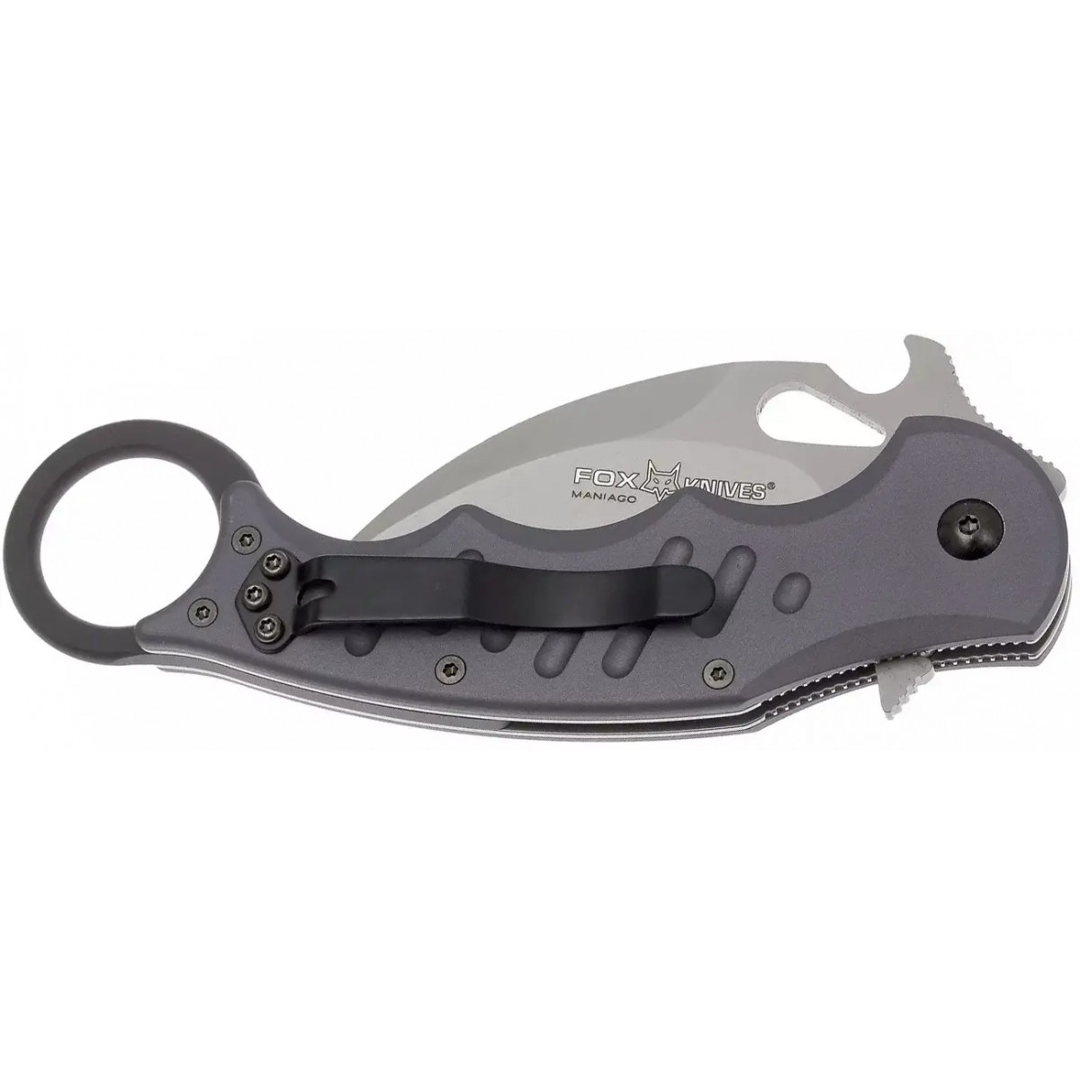 Тактический складной нож Fox Folding Karambit предназначен в основном для самозащиты. Клинок серповидной формы изготовлен из нержавеющей стали N690Co. Рукоять выполнена из авиационного алюминия Т6 -6061 с анодированием и имеет удобные подпальцевые выемки. Керамбит легко открывается одной рукой при помощи отверстия в клинке, а также может доставаться из кармана уже в открытом положении благодаря скобе Эмерсона.