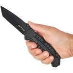 Клинок профиля Tanto point с прямыми спусками от середины обуха выполнен из коррозиестойкой стали марки 3Cr13, которая характеризуется податливостью к правке. Клинок извлекается с помощью двустороннего шпенька и фиксируется в рабочем положении стальной пластиной замка liner lock.