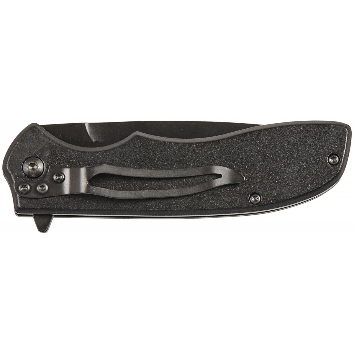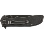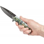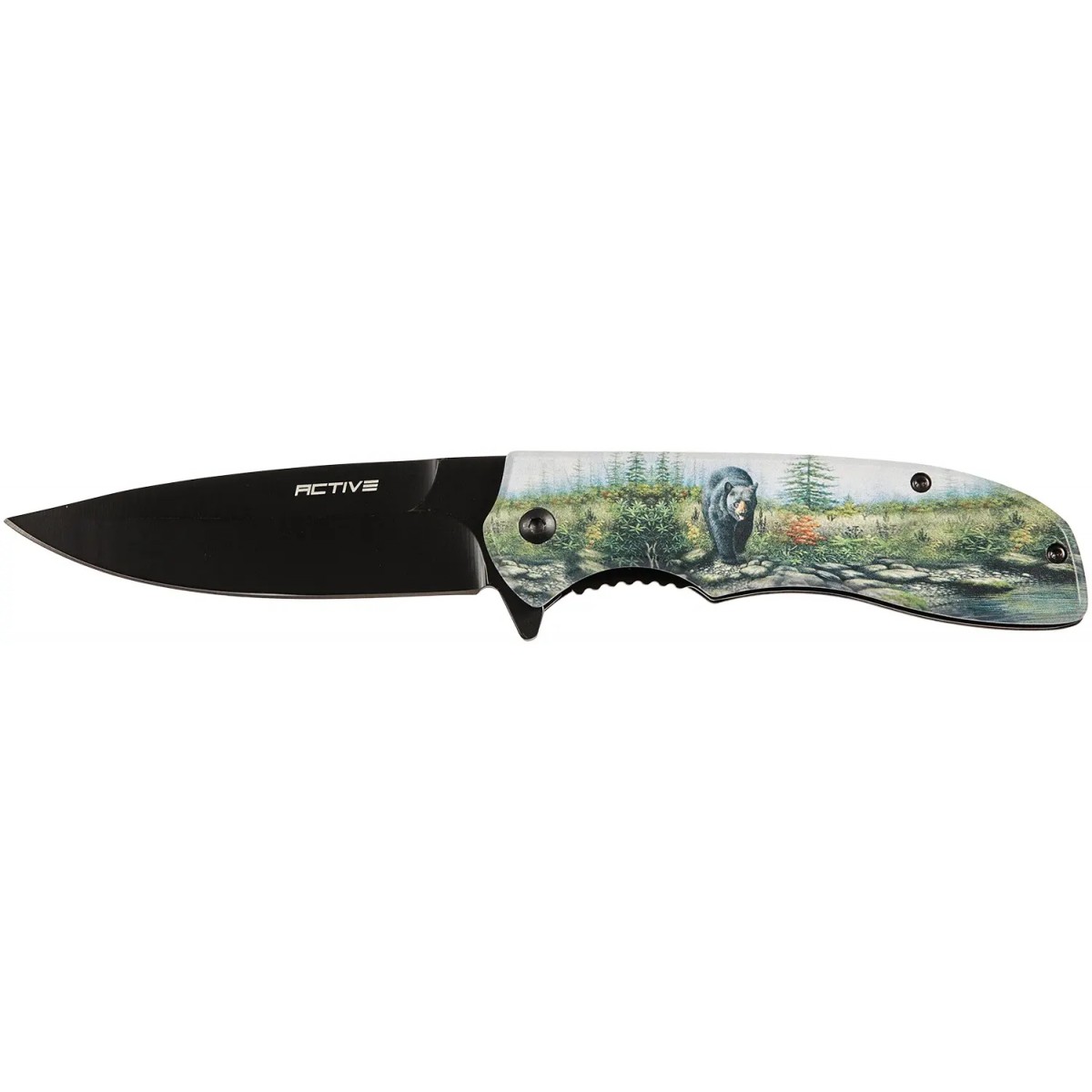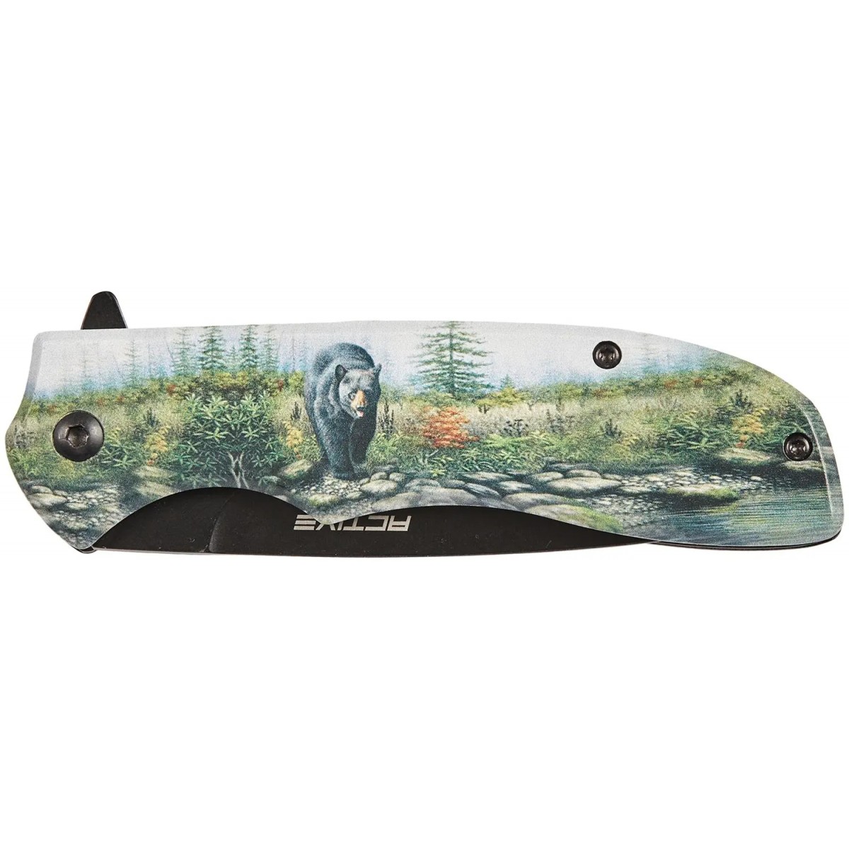 Рукоять удобной формы, прекрасно лежит в руке, имеет накладки из алюминия с чёрным покрытием, на одной из которых - цветное изображение медведя породы Кодьяк. В сложенном виде нож носится в положении tip-down на односторонней клипсе.