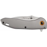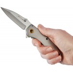 Фиксация клинка осуществляется замком Frame-Lock, пластина которого имеет насечку для более удобного оперирования одной рукой.