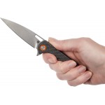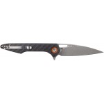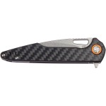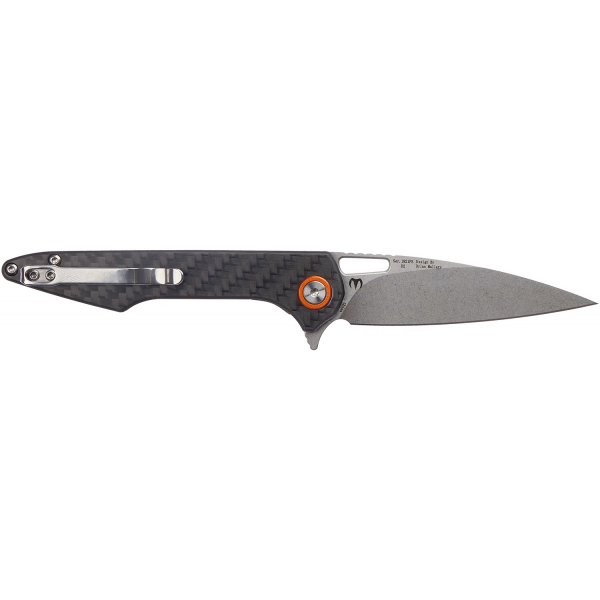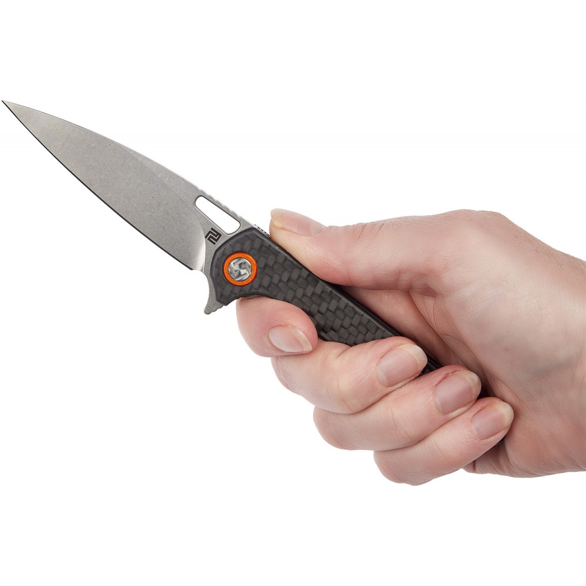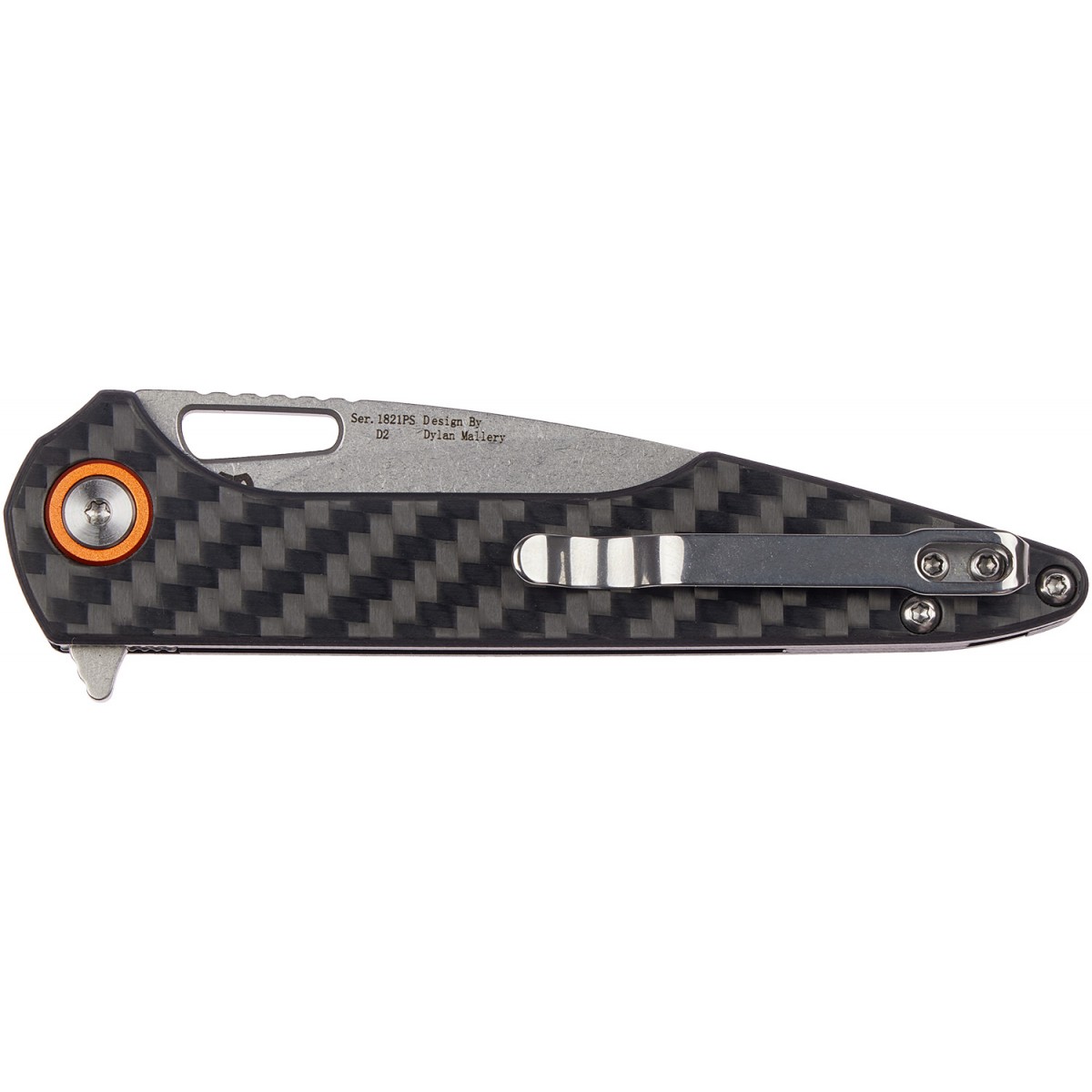 Дизайнерский складной нож Artisan Cutlery Archaeo от известного дизайнера Дилана Маллери. Модель имеет клинок профиля Wharncliffe и изготовлен из высококачественной стали D2. Данный клинок обладает отличными режущими и колющими качествами. Для большего комфорта во время использования, на обух нанесен ряд насечек для упора большим пальцем. Клинок легко приводится в рабочее положение с помощью удобного флиппера или подпальцевого отверстия. Система керамических шарикоподшипников уменьшает фактор трения. Форма рукояти имеет достаточно прямые линии и эргономичный изгиб для надежного удержания. Для изготовления накладок на рукояти использовали углеродистое волокно (карбон). Клинок фиксируется в рабочем положении с помощью надежного замка Liner Lock. Сочетание таких материалов позволяет создать привлекательный внешний вид ножа, а также максимально снизить вес конструкции. Модель оснащена удобной карманной клипсой.
