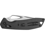 Клинок приводится в рабочее положение с помощью объемного подпальцевого отверстия. Плавный и быстрый выход клинка гарантирует система шарикоподшипников. Фиксируется в рабочем положении надежным механизмом запирания Crossbar Lock. Эргономичная рукоять изготовлена из стеклонаполненного нейлона GFN. Материал долговечен и устойчив к воздействию окружающих факторов. Текстурированная поверхность, которая напоминает отпечатки пальцев, повышает сцепление и контроль во время работы даже в условиях повышенной влажности. Облегченные стальные лайнеры под накладками и бекспейсер повышают прочность общей конструкции.