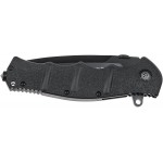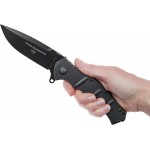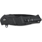 АК101 – мощный нож с клинком 10 см, хорошо подойдёт для охоты, походов и любых экстремальных ситуаций. Рукоять ножа благодаря своей форме, текстуре и наличию упора для большого пальца с насечкой обеспечивает уверенное и комфортное удержание ножа в любых условиях. Под накладками конструкция рукояти усилена за счет стальных пластин толщиной 1,5 мм. Выступ в основании клинка, флиппер, позволяет быстро открыть нож, а после открытия - играет роль гарды для защиты пальцев. Кроме флиппера клинок можно аккуратно открыть пальцем (даже в перчатке) при помощи специального упора – диска на обухе клинка. Клинок сделан из стали 440С или D2, его изогнутая форма с небольшим «брюхом» позволяет комфортно резать самые различные материалы. Для экстренных ситуаций в рукояти ножа установлен стеклобой. Замок ножа – «лайнер-лок», клипса позвроляет носить нож в кармане в положении остриём клинка вверх.