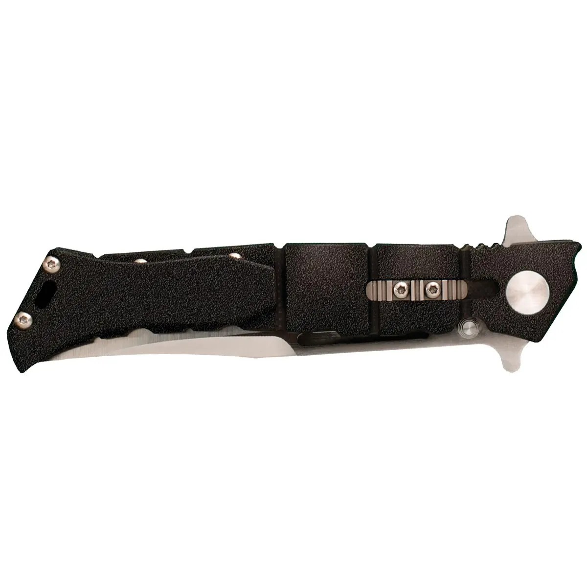 Клинок снабжен двумя флипперами и шпеньком, что дает еще два варианта раскрытия дополнительно к инерционному выбросу клинка. Выброс легкий благодаря тяжелому клинку и подшипникам на оси.
