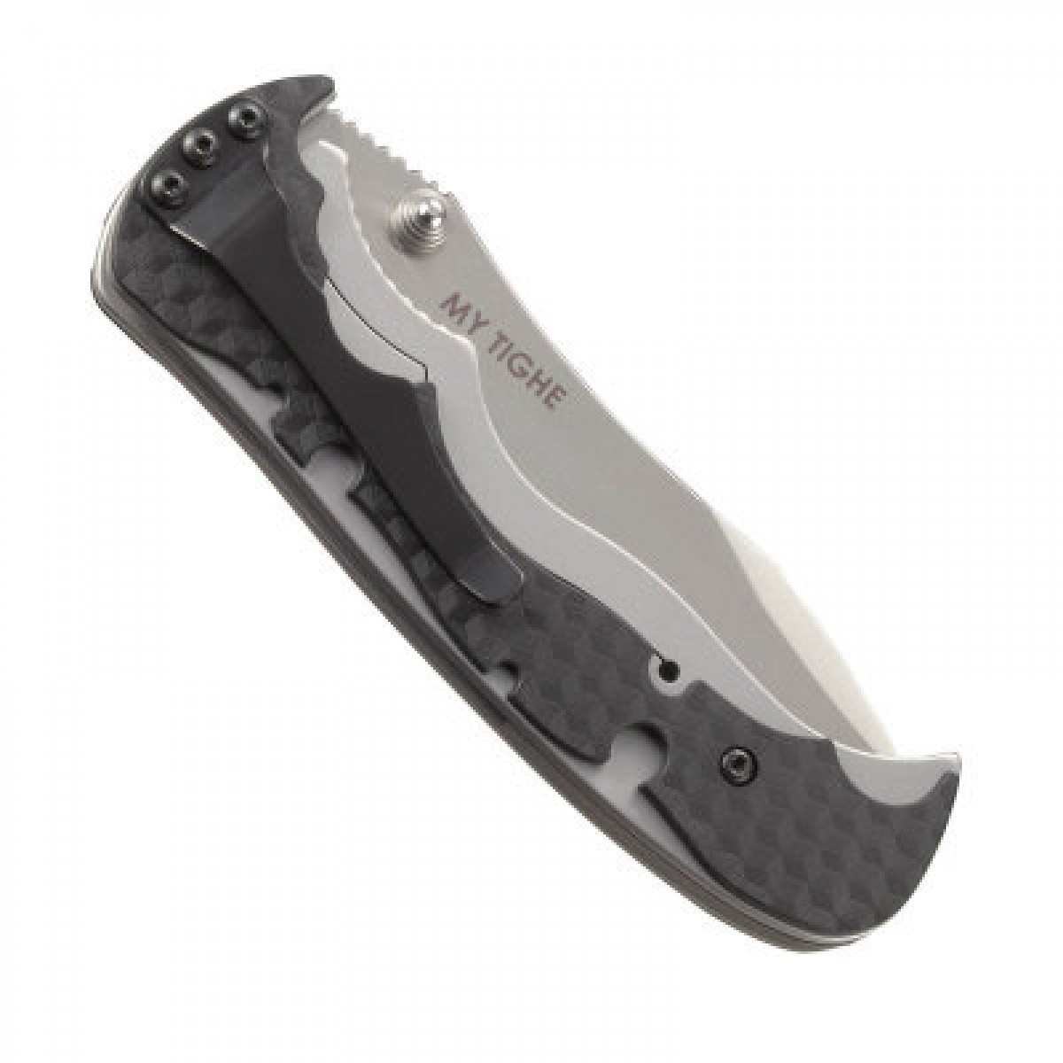Замок «frame-lock» изготовлен из высокопрочной нержавеющей стали 420J2 и алюминия марки 6061 T6. Каркас ножа обработан пескоструем, накладки на рукоять изготовлены из стеклонейлона, фактура как у карбонового покрытия.