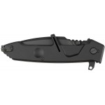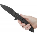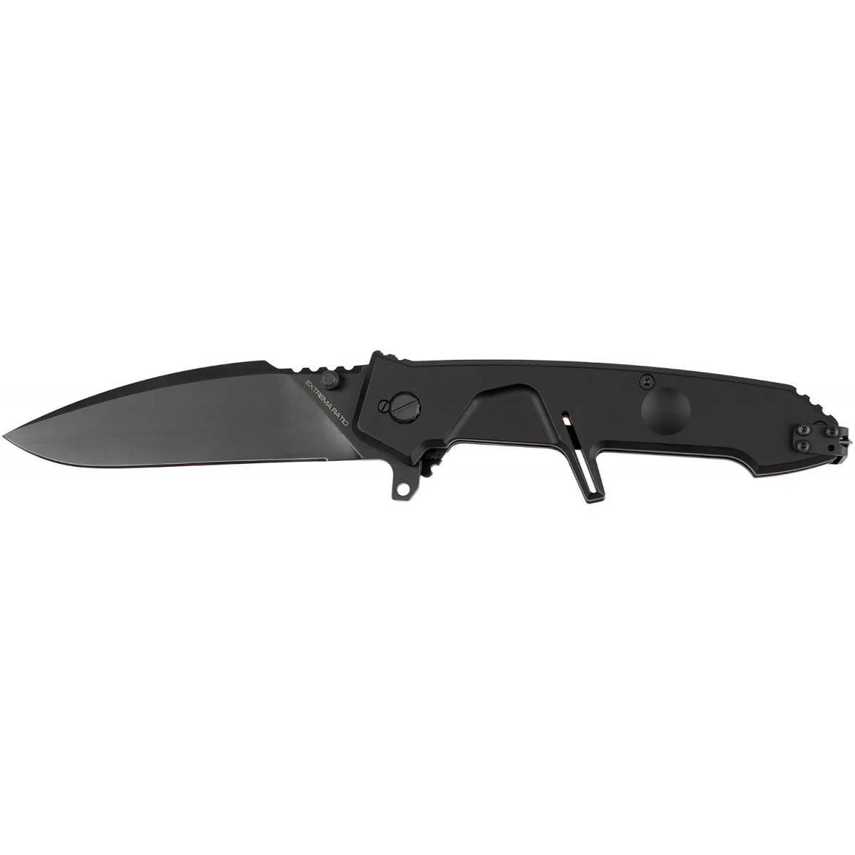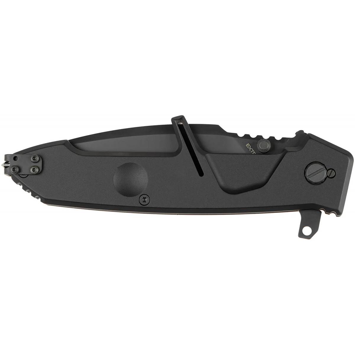 Широкий клинок профиля Drop Point наделяет нож отличными колюще-режущими качествами, а легированная кобальтом сталь Böhler N690 твердостью 58 HRC хорошо выдерживает интенсивные нагрузки, в том числе и поперечные. Финишное покрытие клинка Black Oxide MIL-C-13924 прекрасно защищает от коррозии и может варьироваться в зависимости от модели: чисто черное или с лазерной гравировкой в виде маскировочных полос. Для комфорта и уверенности во время использования, на обухе размещен ряд массивных насечек для упора большим пальцем. Приводится в рабочее положение, как левой, так и правой рукой, с помощью двустороннего шпенька. Фиксируется в открытом виде с помощью надежного замка Liner Lock. Extrema Ratio позаботилась о безопасности и для предотвращения случайного открытия был установлен предохранитель, который надежно фиксирует клинок в открытом или закрытом положении. Также линейка MF получила нововведение - регулировочный осевой винт, благодаря которому можно отрегулировать плавность выхода клинка.
