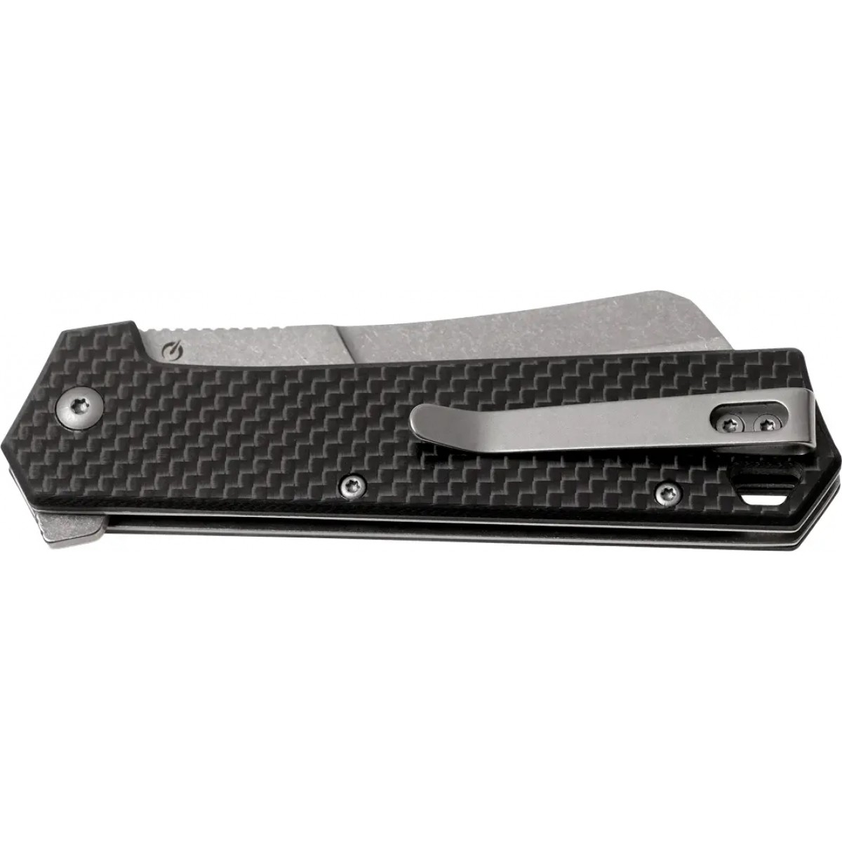 Клинок-тесак выполнен из нержавеющей стали марки 8Cr13MoV, закаленной до твердости 56-58 HRC, с финишной обработкой Black Stonewash. Сталь обладает хорошей коррозийной стойкостью и способна длительное время удерживать остроту режущей кромки. Подпружиненный клинок извлекается с помощью флиппера и надежно фиксируется в рабочем положении с помощью замка Liner Lock. Быстрый и легкий выход клинка обеспечивается благодаря наличию системы шарикоподшипников.
