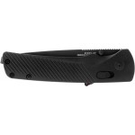 Клинок с прямым обухом изготовлен из стали марки D2 с криогенной обработкой, повышающей износостойкость. Клинок может иметь финишное покрытие из нитрида титана черного цвета, которое защищает сталь от повреждений или сатиновый финиш. Подпружиненный клинок извлекается с помощью шпенька и надежно фиксируется в рабочем положении двусторонним замком AT-XR. Конструкция замка предусматривает блокировку случайного открытия.