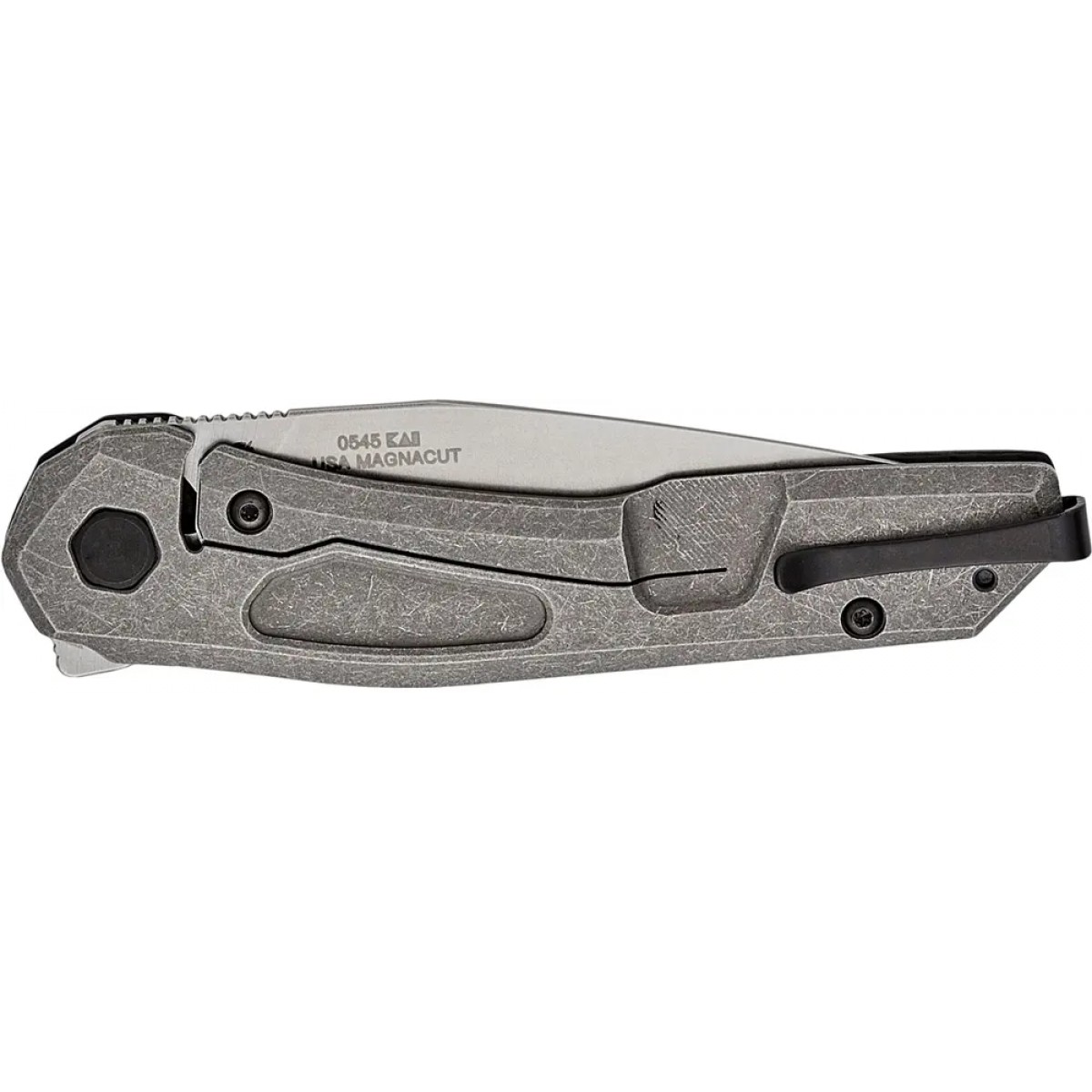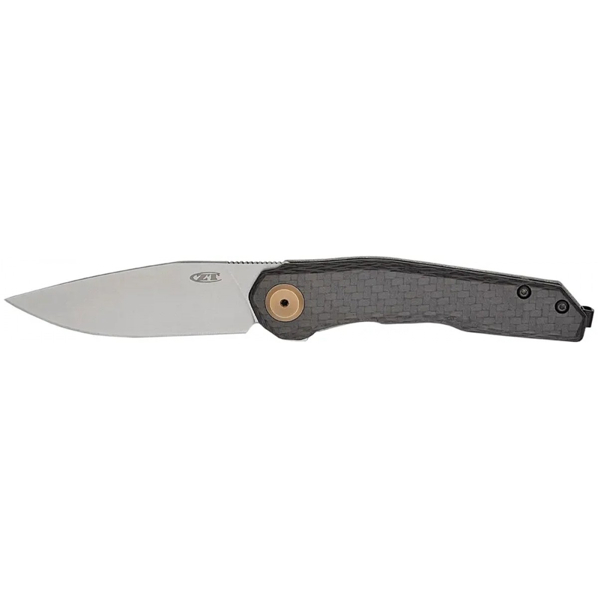 Модель ZT 0545 от всемирно известного ножевого концерна KAI представляет собой универсальный фолдер. Его зона использования начинается стильным джентельменским аксессуаром и заканчивается практичным и надежным помощником в ежедневных задачах. Клинок профиля Drop Point изготовлен из премиальной порошковой стали CPM-MagnaCut. Сталь сбалансирована, обеспечивает превосходное сохранение остроты режущей кромки, прочность и коррозионную стойкость. Обработка клинка stonewash придает матовости и маскирует следы эксплуатации. На обухе размещен ряд небольших насечек для упора большим пальцем во время силовых работ. Небольшой чойл у пяты клинка облегчает заточку и выполнение более деликатных задач. Приводится в рабочее положение с помощью удобного флиппера, а фиксируется надежным титановым замком Frame Lock. Легкость открытия гарантирует система щарикоподшипников KVT. Верхняя накладка на рукояти изготовлена из карбона (углеродное волокно). Рукоять имеет эргономичные выемки под пальцы, благодаря чему комфортно ложится в руку. На торце размещена карманная клипса глубокой посадки. Завершает общий дизайн анодированный осевой винт с бронзовым покрытием.