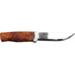 Этот нож прекрасно подойдет ценителям крупных высокоэффективных ножей. Клинок изготовлен из традиционной трехслойной стали, а рукоятка – из древесины карельской березы.
