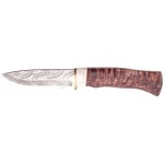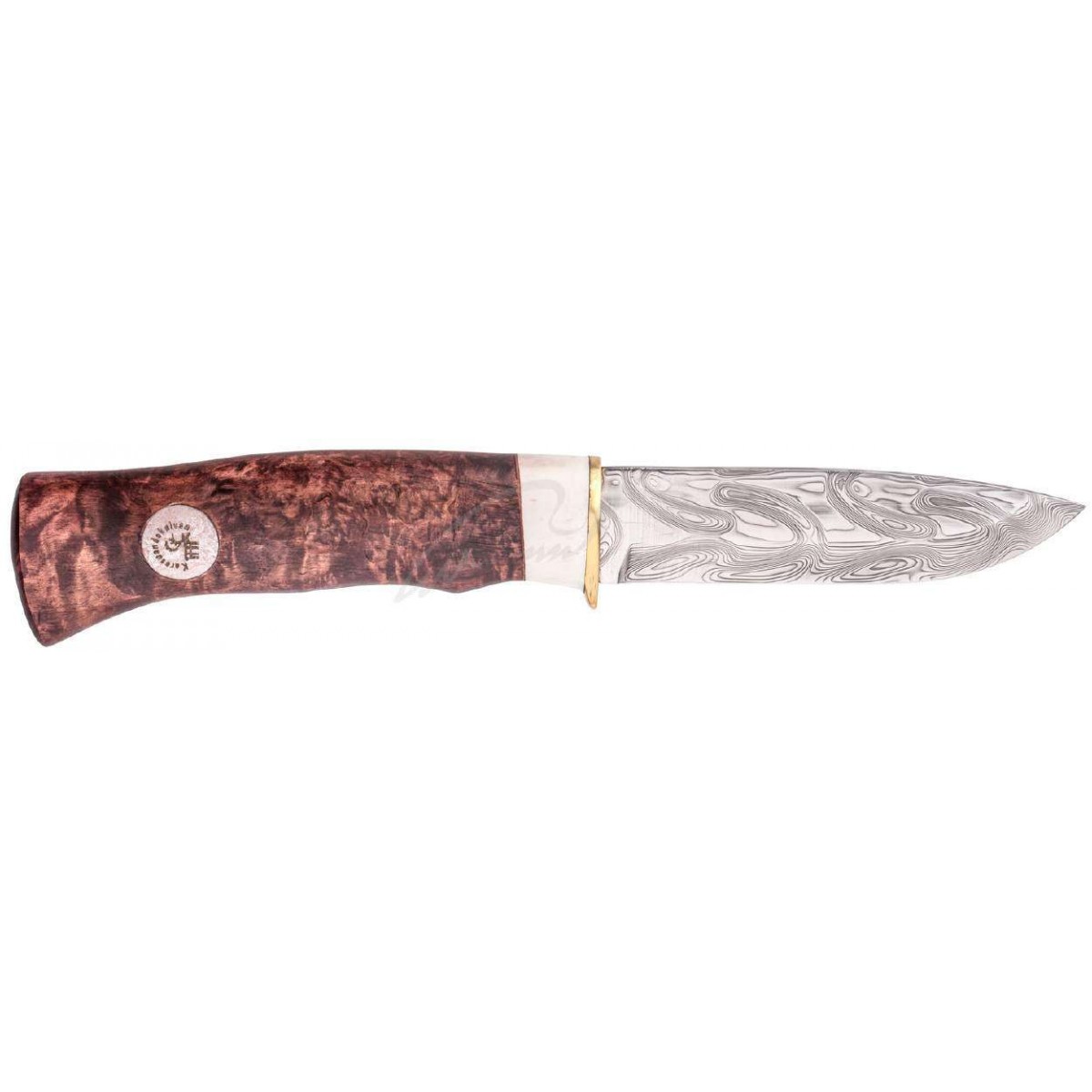 Клинок типа drop point изготовлен из стали Sandvik 12C27/дамасской стали, обладающей устойчивостью к коррозии, превосходными характеристиками заточки и прочностью. Режущую кромку формируют прямые «скандинавские» спуски (одновременно являющиеся подводами), которые с легкостью решают проблему удержания угла при заточке. Рукоять выполнена из карельской березы и рога северного оленя. В комплекте идут традиционные кожаные ножны с пластиковой вставкой.