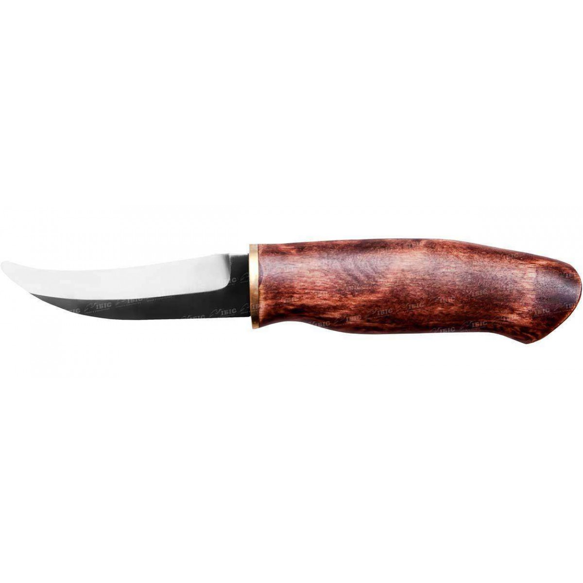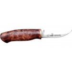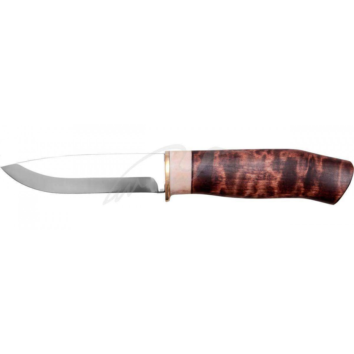 Традиционный охотничий шведский нож. Клинок изготовлен из высококачественной нержавеющей стали, обладающей одновременно отменными характеристиками заточки, высокой прочностью и устойчивостью к коррозии. Материал рукояти – карельская береза. Между клинком и рукоятью установлены вставки из оленьего рога, а на самой рукоятке предусмотрен небольшой защитный выступ (гарда).Модель Karesuandokniven Jagaren Dubbel комплектуется кожаными ножнами, а также вспомогательным ножом-скинером меньшей длины, который можно использовать для снятия шкуры.