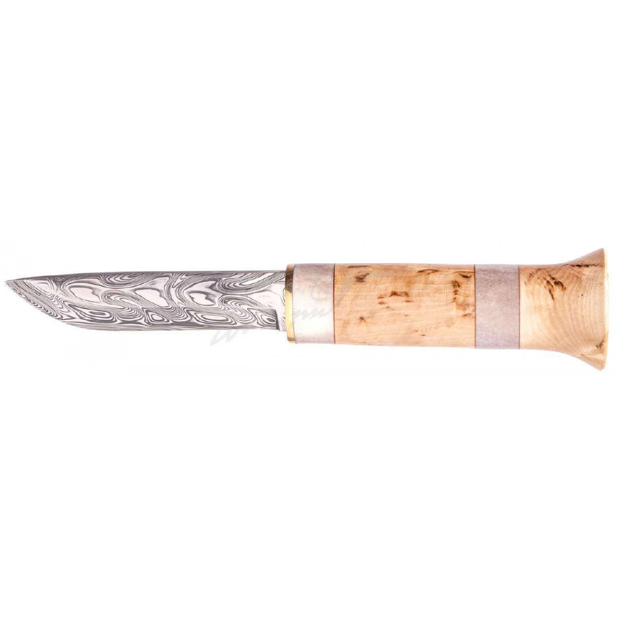 Рукоять выполнена из светлой карельской березы и оленьего рога. Клинок изготовлен из нержавеющей стали Sandvik 12C27/ дамасской стали, закаленной до твердости 57HRC. Режущую кромку формируют прямые «скандинавские» спуски, которые с легкостью решают проблему удержания угла при заточке.