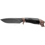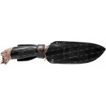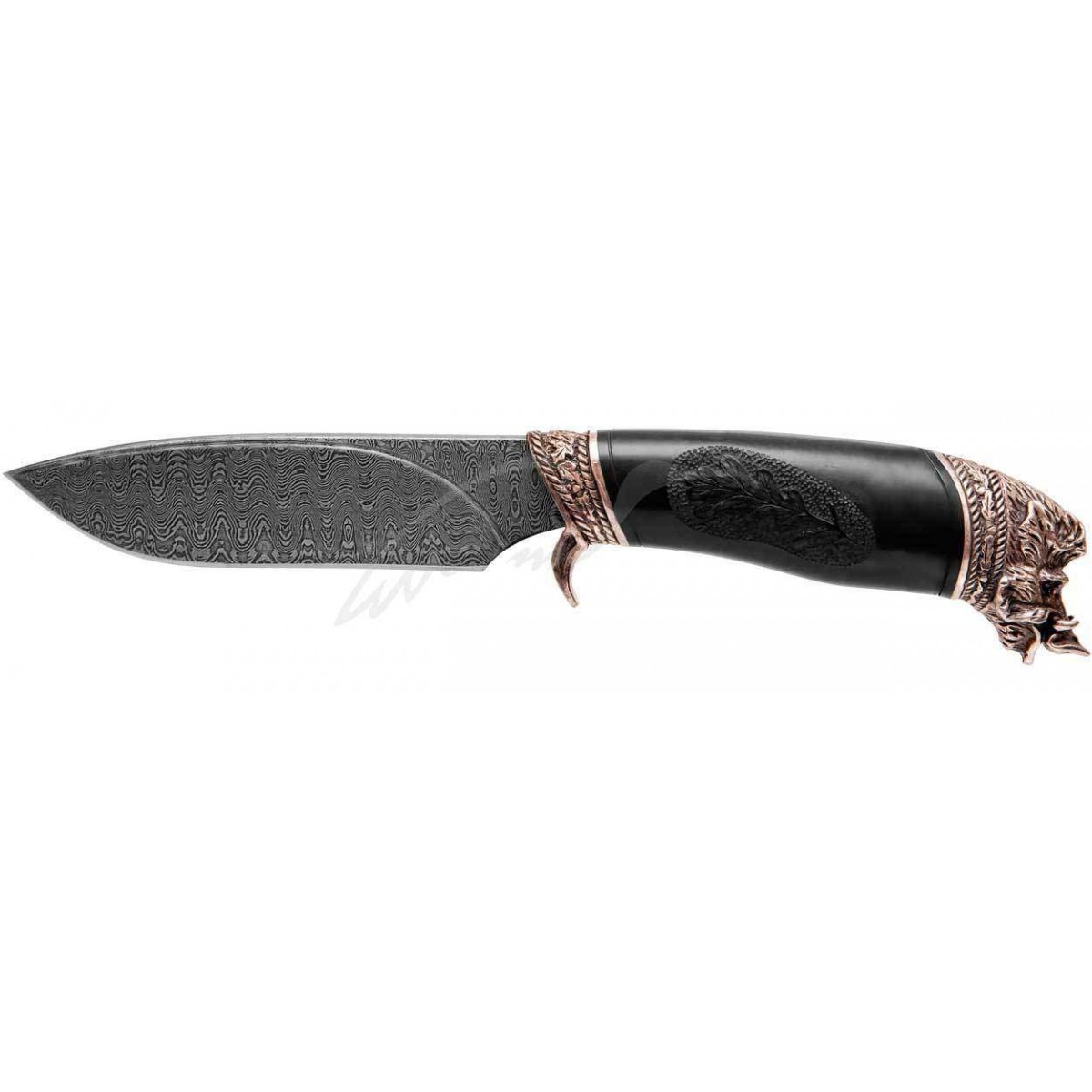 Классический охотничий нож. Рукоять с навершием в виде кабаньей головы удобно ложится в руку. Простой с брюшистым лезвием клинок удобен для разделки дичи. Развитая гарда не дает соскользнуть руке при рубящих и колющих ударах.