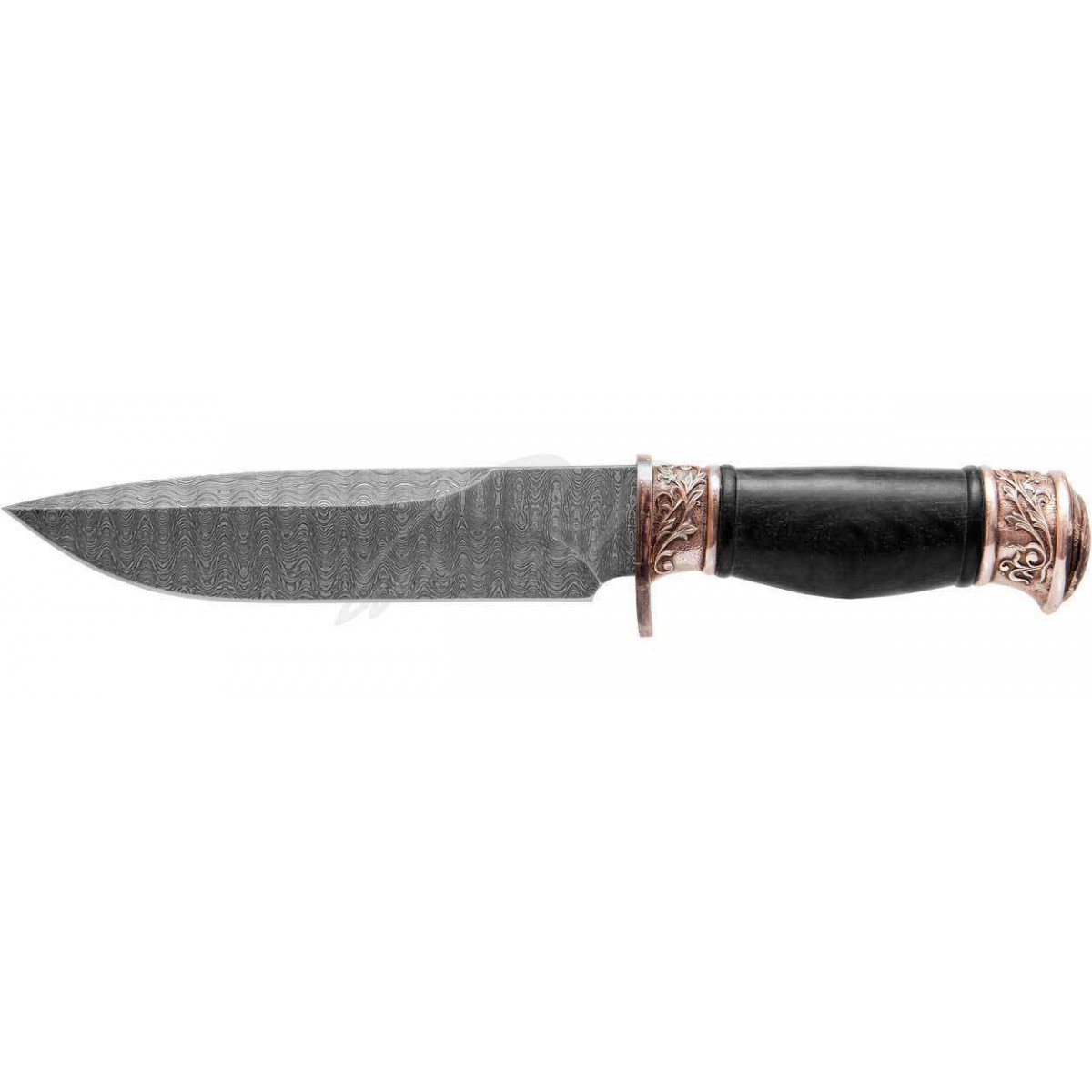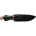 Красивый охотничий нож. Мощный обоюдоострый клинок, простая цилиндрическая рукоять, развитая гарда - вот характеристики рабочего ножа. Но авторы добавили изящный растительный орнамент и барельеф сеттера на металлический прибор рукояти, и нож стал выглядеть богато, сразу приобрел художественную ценность и перешел в разряд подарочных и коллекционных.