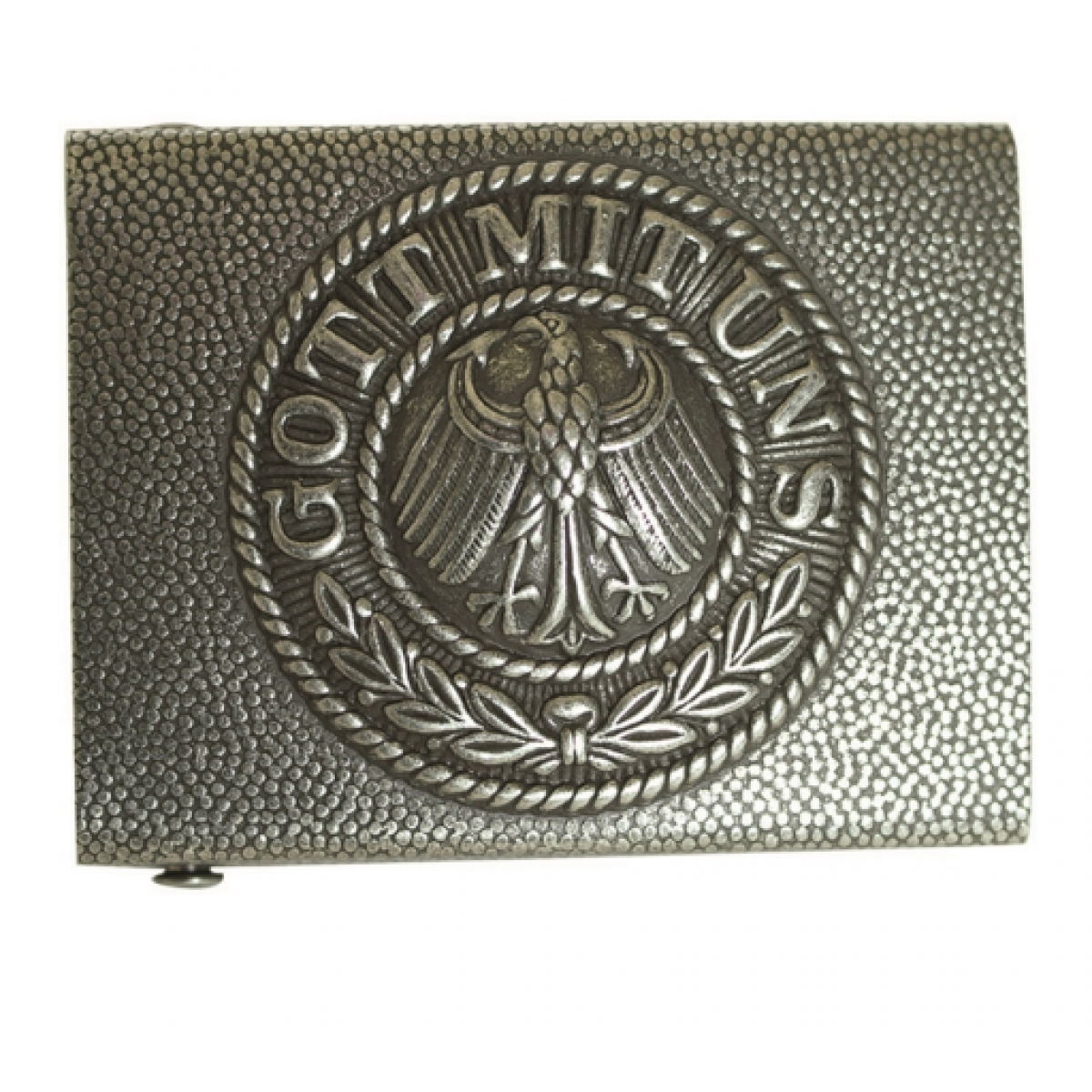 Точная пряжки Reichswehr. Зерненая пряжка с выштампованым орлом и надписью "С нами Бог". Оборудована правильными зацепом и штырем для крепления на ремень. Надевается на 45мм кожаный черный ремень с специальным зацепом для этой пряжки.