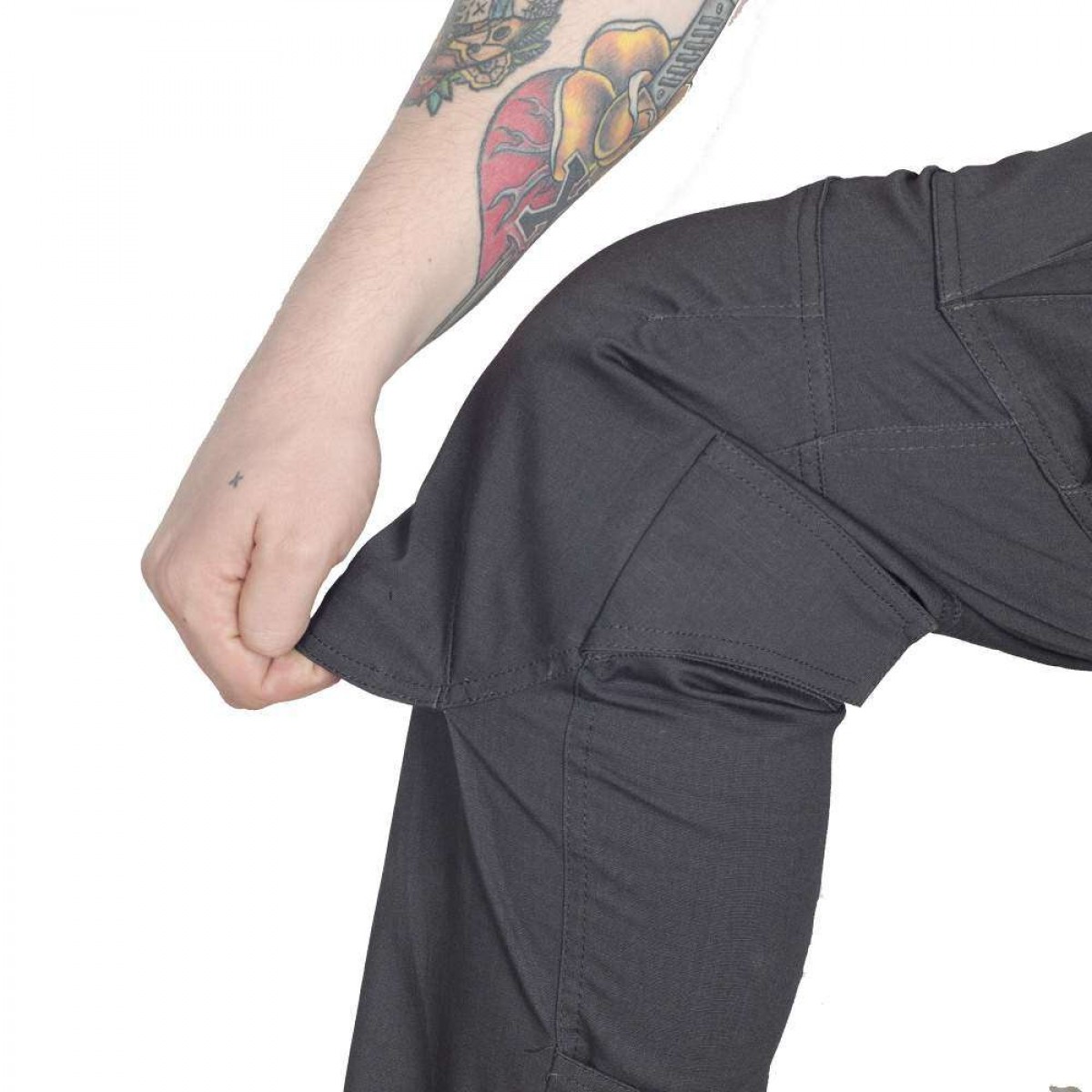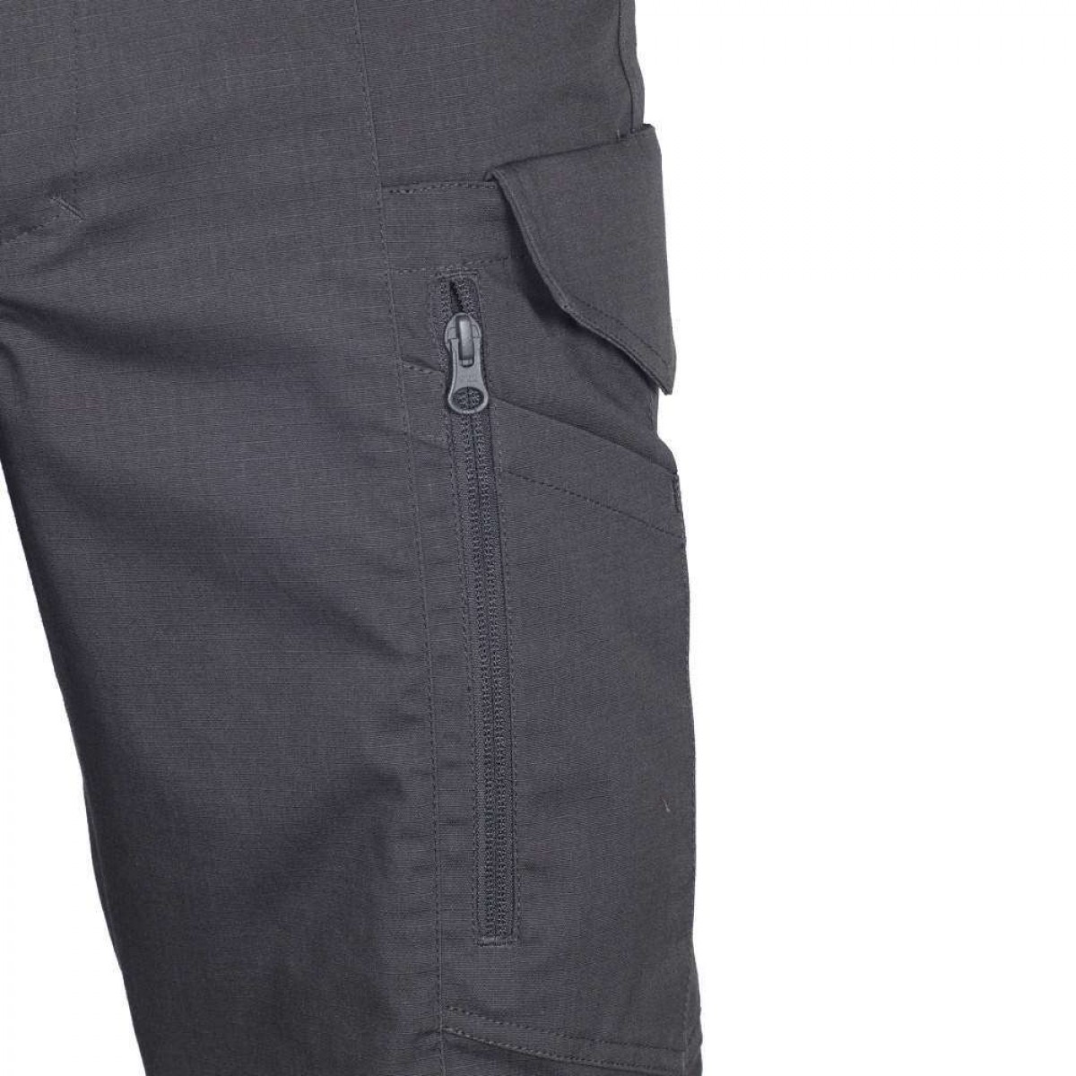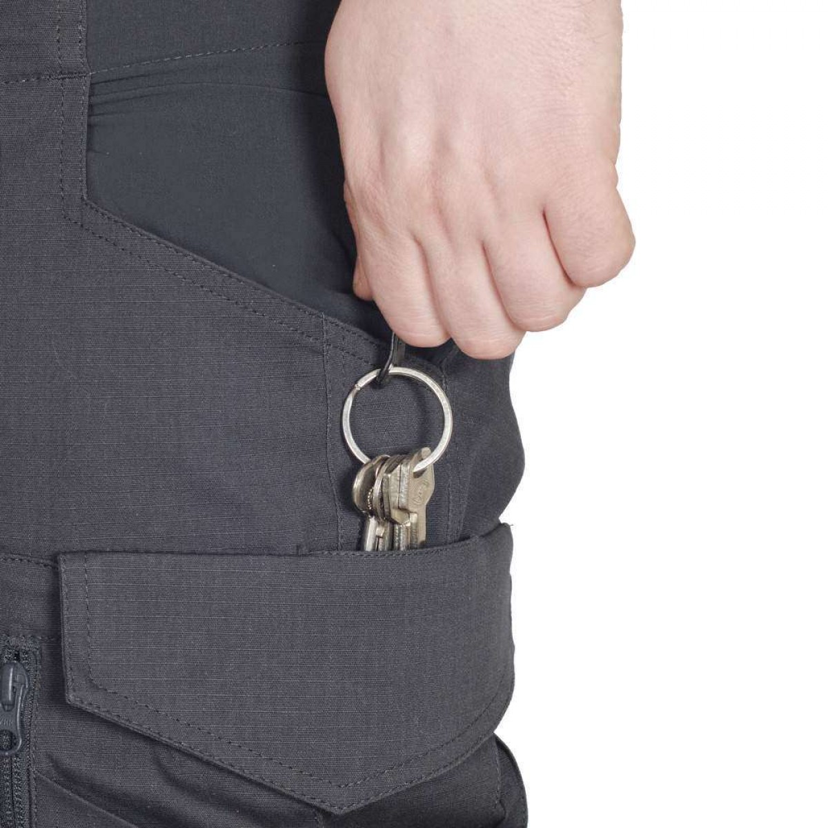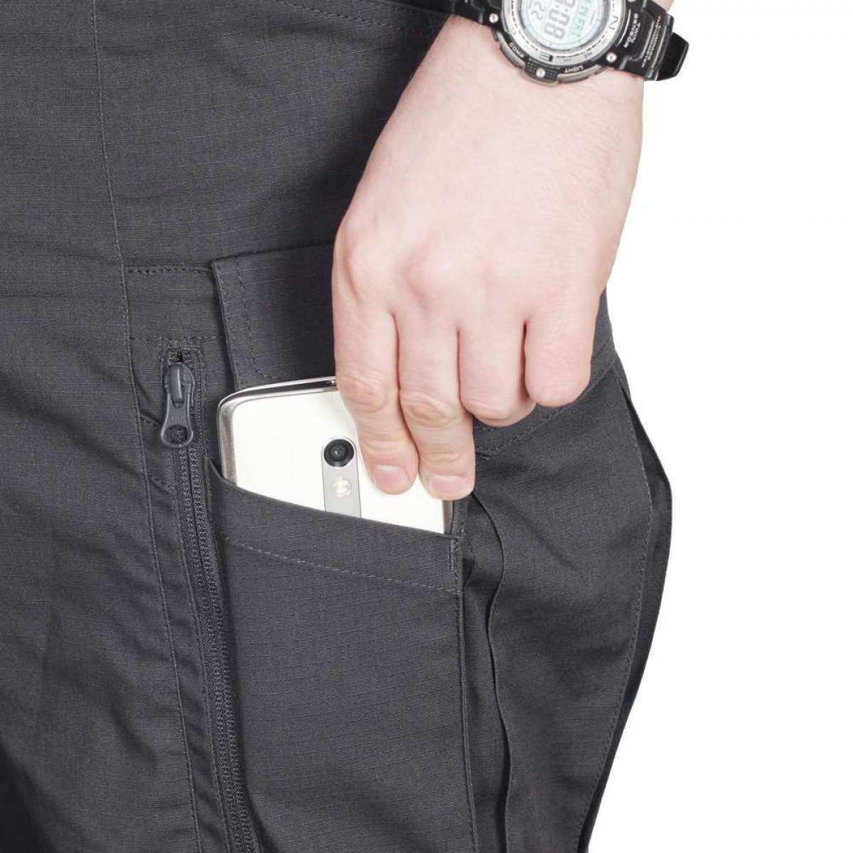 Задние прорезные карманы закрываются на «молнию». Комплексный карго карман оборудован
