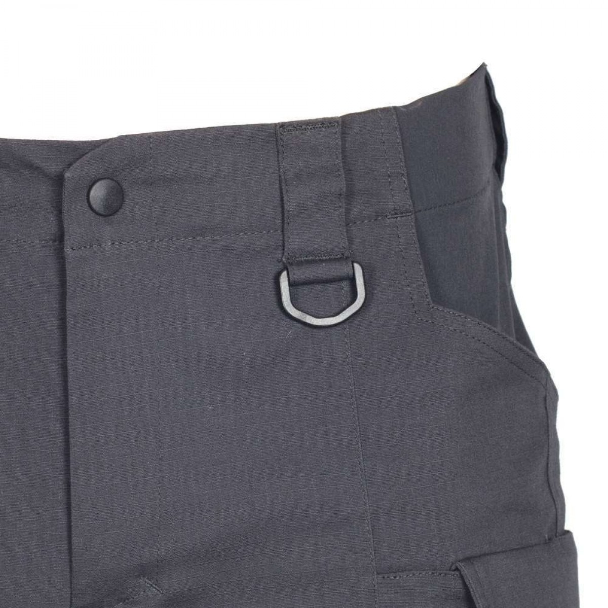 Пояс брюк закрывается на молнию и пуговицу, оборудован шлейками для ремня шириной до 5,5 см, Спереди к поясу пришиты два D-кольца для подвеса различного оборудования.