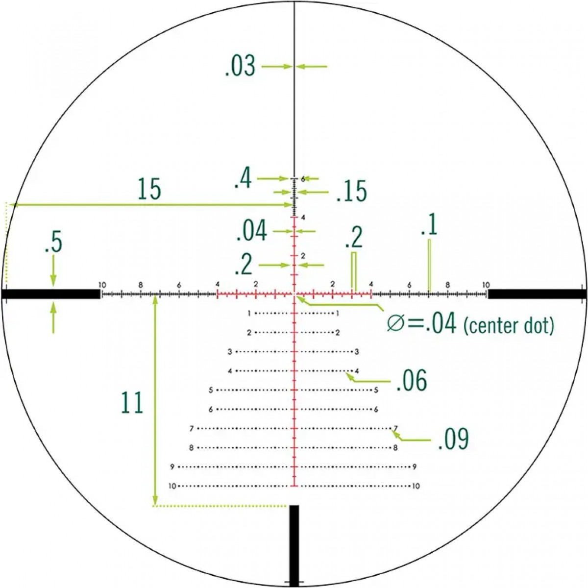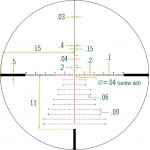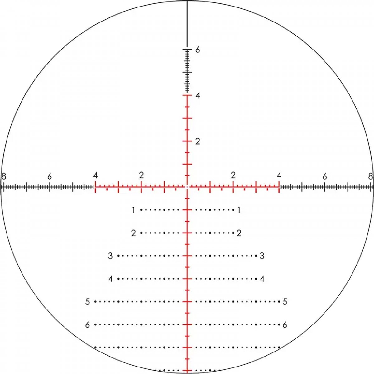 Прицельная сетка XLR-2 (MRAD) с подсветкой расположена в первой фокальной плоскости. Сетка масштабируется вместе с изображением, обеспечивая точные подсчеты на всех кратностях. Подсветка имеет 10 уровней яркости. Элемент питания CR2032 обеспечивает ее бесперебойную работу в течение 36 часов (на 6 уровне яркости).