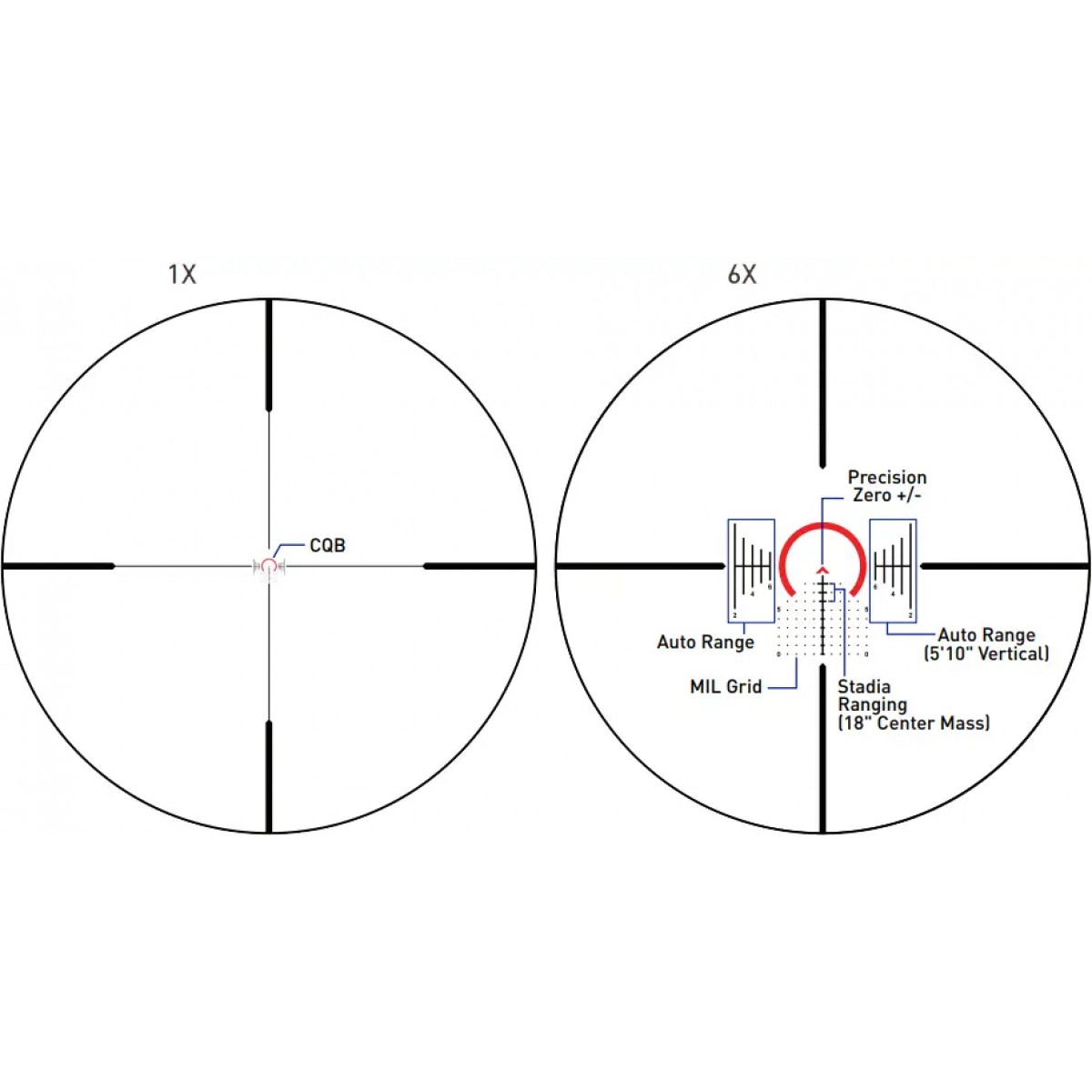 Прицел GLx 1-6x24 мм оснащен мультикалиберной прицельной сеткой ACSS Griffin M6, расположенной в первой фокальной плоскости. Эта универсальная прицельная сетка включает в себя подкову, которая при малом увеличении работает как красная точка, обеспечивая непревзойденную скорость прицеливания на близких дистанциях. Автоматическая система определения дальности позволяет легко оценивать цели на расстоянии до 600 ярдов. При увеличении 6х все возможности прицельной сетки раскрываются в полной мере, предлагая наведение на движущуюся цель и использование MIL-dot, что позволяет делать точные выстрелы на дальних дистанциях боеприпасом любого калибра, а "шеврон" обеспечивает бесконечно точную точку прицеливания.