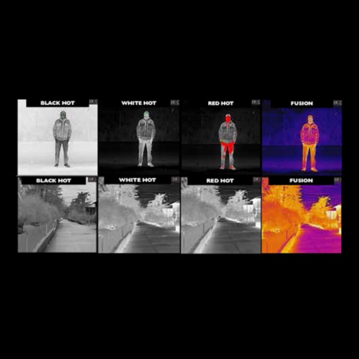 Еще одной важной особенностью модели является сочетание достаточно широкого угла обзора и сравнительно большой дальности обнаружения источников тепла. Это стало возможным благодаря новой матрице с увеличенным разрешением. Набор стандартный палитр для тепловизоров от KONUS: white hot, black hot, fusion, red hot.