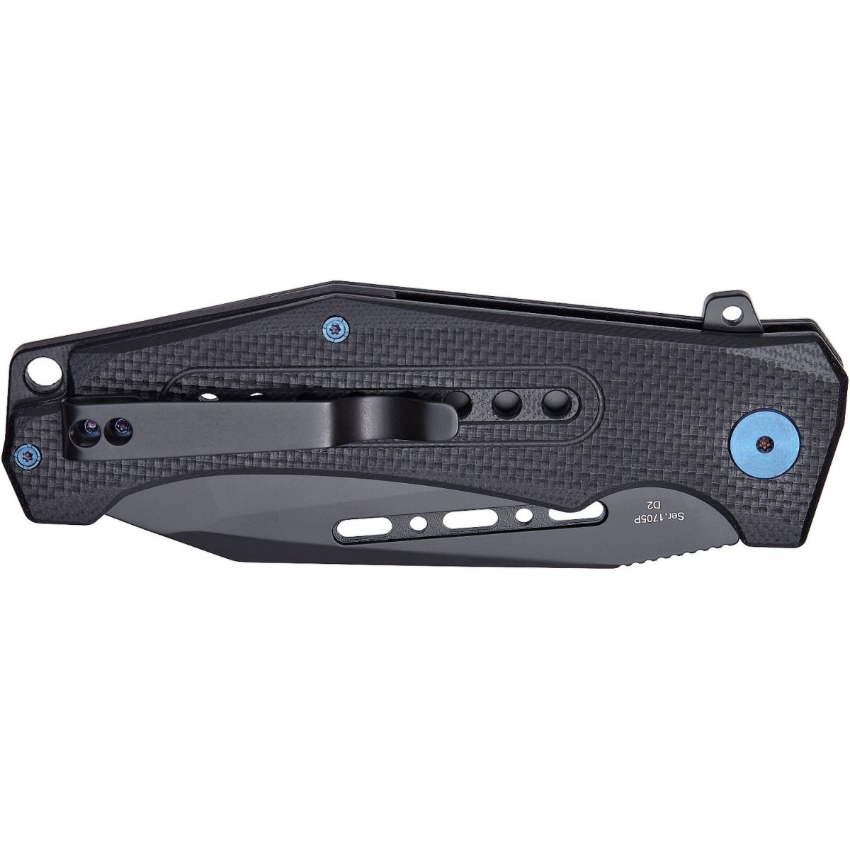 Рукоять изготовлена из износостойкого стеклотекстолита G10, который предотвращает скольжение ножа в руке и способствует лучшему удержанию в ладони. Клинок изготовлен из высококачественной стали D2, имеет защитно-декоративную обработку металла “Stonewash”, что придает неоднородную матовую поверхность клинку. Для быстрого извлечения клинка имеется шарикоподшипниковый механизм, а замок типа Liner Lock обеспечивает надежную фиксацию клинка. Модель оснащена карманной клипсой и креплением для темляка.