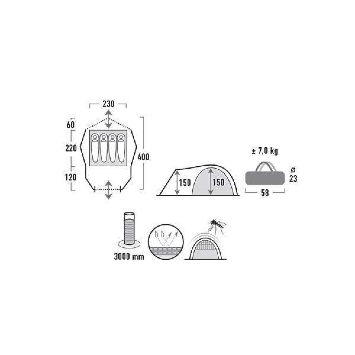 - Габариты внешней палатки (ДхШхВ), мм: 4000x2300x1500